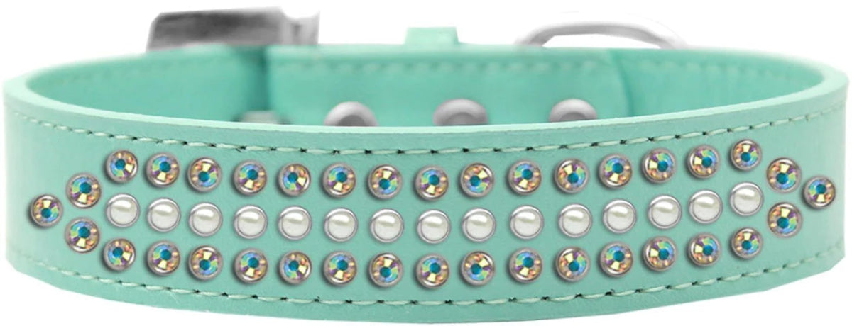 Q: What makes this collar a unique choice for pet fashion?A: The Ritz Pearl & Aurora Borealis Crystals Collar stands out due to its elegant design featuring one row of pearls surrounded by two rows of stunning crystals. This combination makes it a fashionable accessory that enhances your pet's style while ensuring comfort with a 1-inch wide collar.