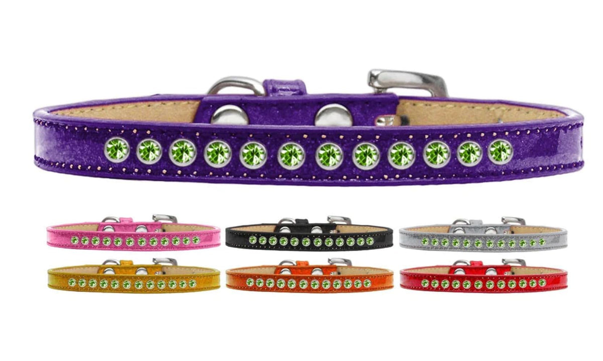 Add sophistication and elegance to your fur baby's wardrobe with a dazzling Crystal Puppy Ice Cream Dog Collar! These soft Glittery Collars are 3/8'' wide and features one row of handset lime green crystal stones.
