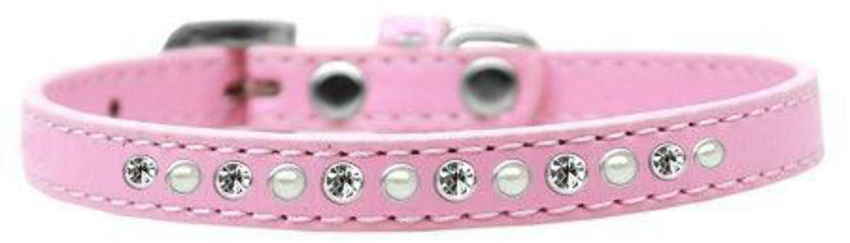 3/8'' wide collar adorned with 1 row of pearls and rhinestones along with a rhinestone buckle