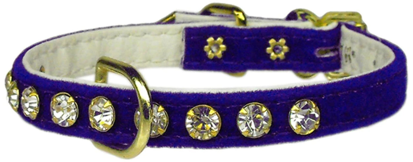 Simple yet elegant! These 5/16" wide collars are made from our wonderful velveteen material and come with one row of clear prong-set rhinestones, and a center D-ring for a leash to attach. This collar is available in an array of sizes and colors.