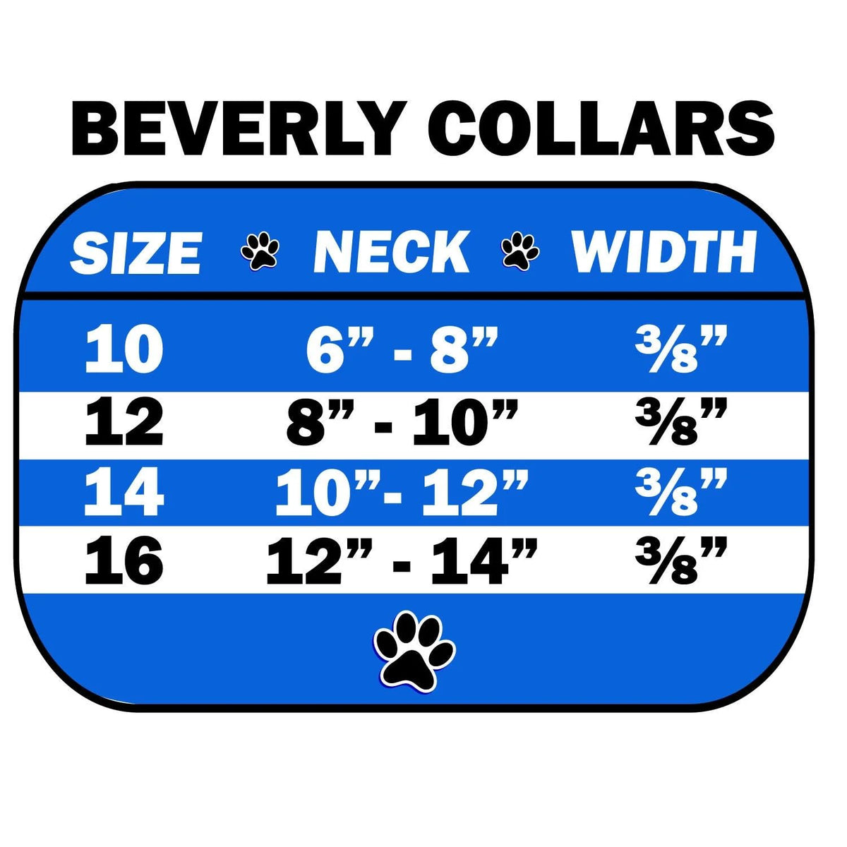 Q: What sizes are available for the Beverly dog collar?A: The Beverly dog collar is available in various sizes. To ensure the perfect fit, measure your pet's neck and refer to our sizing chart. If your pet's neck measurement falls between sizes, we recommend choosing the larger size for comfort.