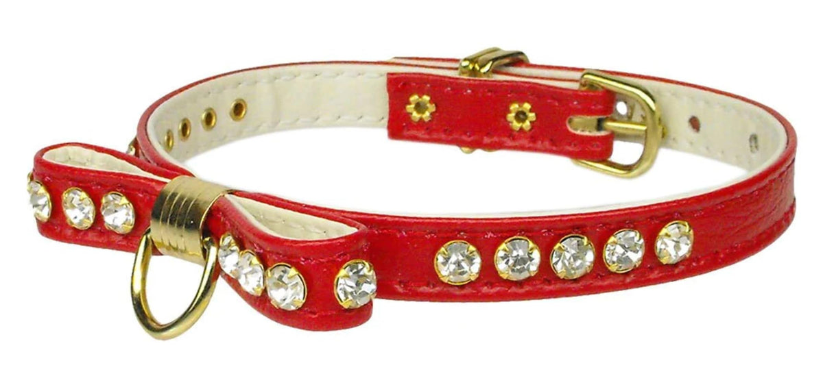 We love the jeweled bow on this dog collar! This ?" wide collar comes with a crystal bow, and is jeweled with one row of rim set clear crystals and also comes with a center D-Ring. This collar is available in an array of sizes and collar colors.
