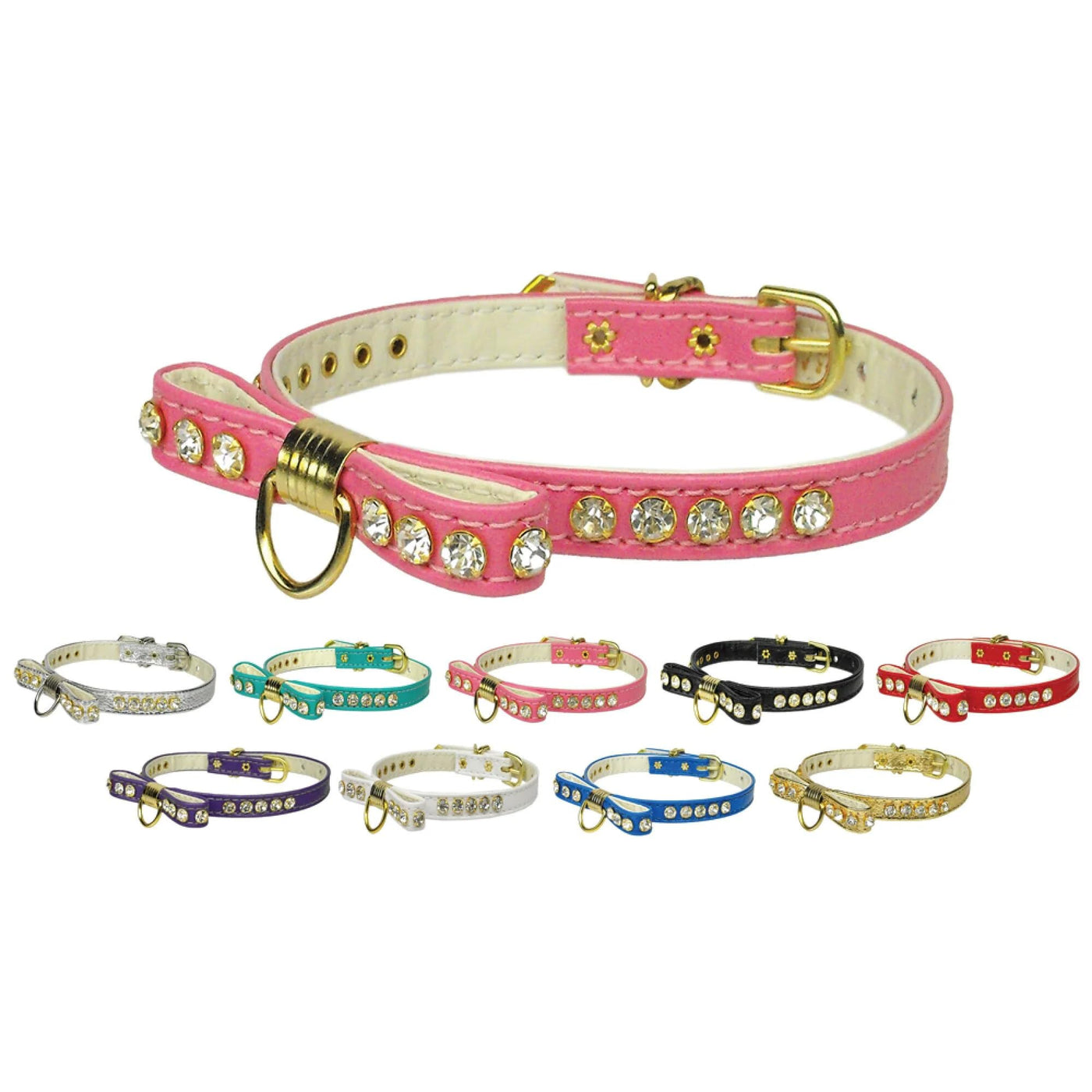 Q: What makes this collar unique compared to other dog collars?A: The Dog, Puppy & Pet Collar features a unique jeweled bow design adorned with clear crystals, adding a touch of elegance and personality. Its combination of style and functionality sets it apart from standard collars.