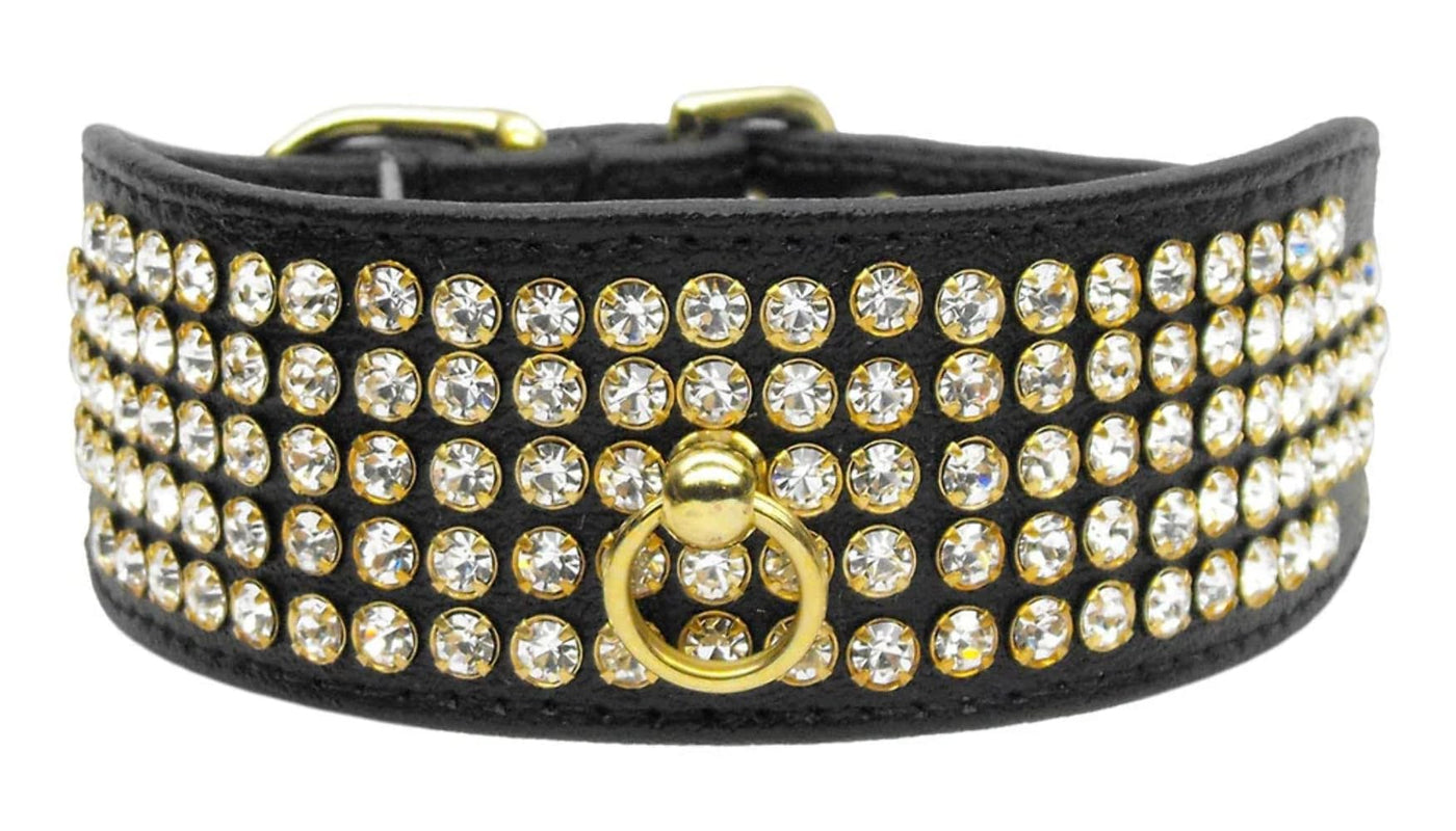 The pinnacle of posh! This 1 ½" wide crystal collar comes with 5 glistening rows of prong set rhinestones. The wide collar tapers down to 1/2" near the buckle for added comfort, and has a center post for a pet I.D. Tag. Your pet will shine from far away!