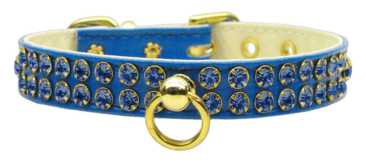 We love the sparkling crystals on this dog collar! This ½" wide collar is jeweled with with two rows of stunning prong-set rhinestones, and comes with a center post where an I.D. tag can be attached. This collar is available in an array of sizes and colors.
