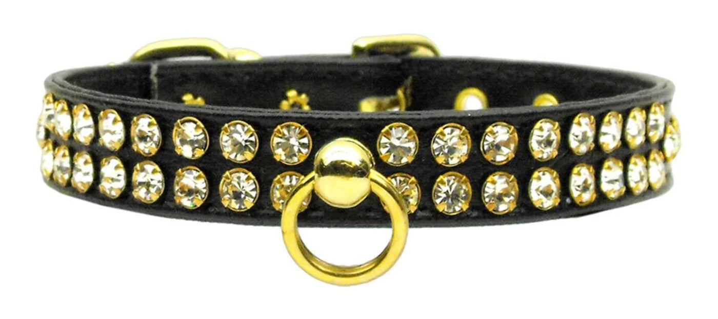 We love the sparkling crystals on this dog collar! This ½" wide collar is jeweled with with two rows of stunning prong-set rhinestones, and comes with a center post where an I.D. tag can be attached. This collar is available in an array of sizes and colors.