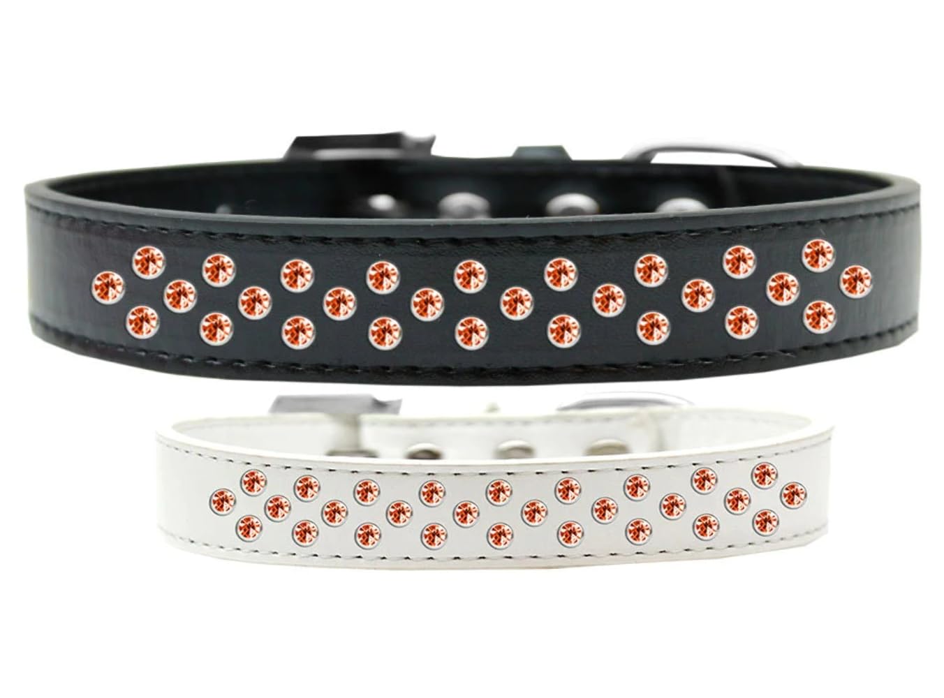 Q: What makes the 'Orange Crystal Sprinkles' Dog Collar unique?A: This collar stands out due to its stylish design featuring two rows of orange rhinestones and a rhinestone buckle, making it a fashionable accessory for your pet while being made in the USA.