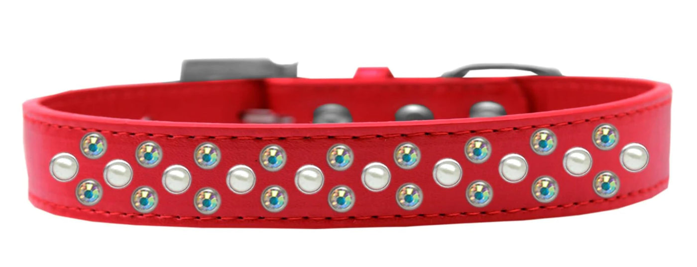 These stellar 3 Row Crystal Collars which we lovingly call our ''Sprinkles'' line are a faux leather featuring crystals around the outside. This collar is available in multiple collar/stone colors and an array of sizes. These soft collars are 3/4'' wide and features three sprinkled rows of crystal stones.