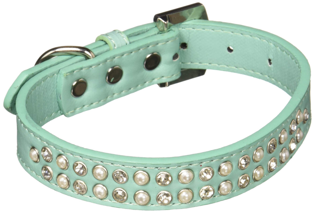 Mirage Pet Products Two Row Pearl And Clear Crystal Aqua Dog Collar Size 16. 3/4'' Wide Collar Adorned With 2 Rows Of Pearls And Clear Crystals. There Is Also A Rhinestone Buckle. Fits A Neck Size From 12-14''. Made In The Usa.