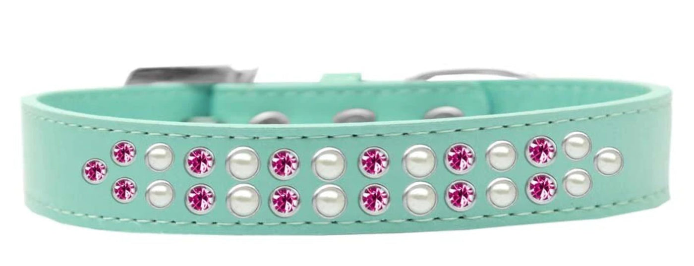 Q: What makes the Two Row Pearl and Pink Crystal Dog Collar unique?A: This collar stands out due to its elegant design featuring two rows of pearls and clear crystals, adding a touch of fashion to your pet's look while ensuring comfort.