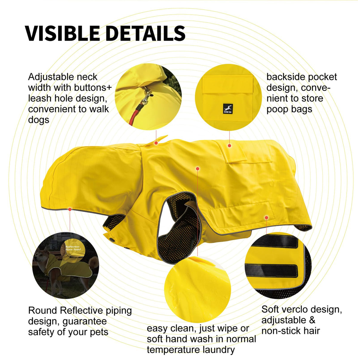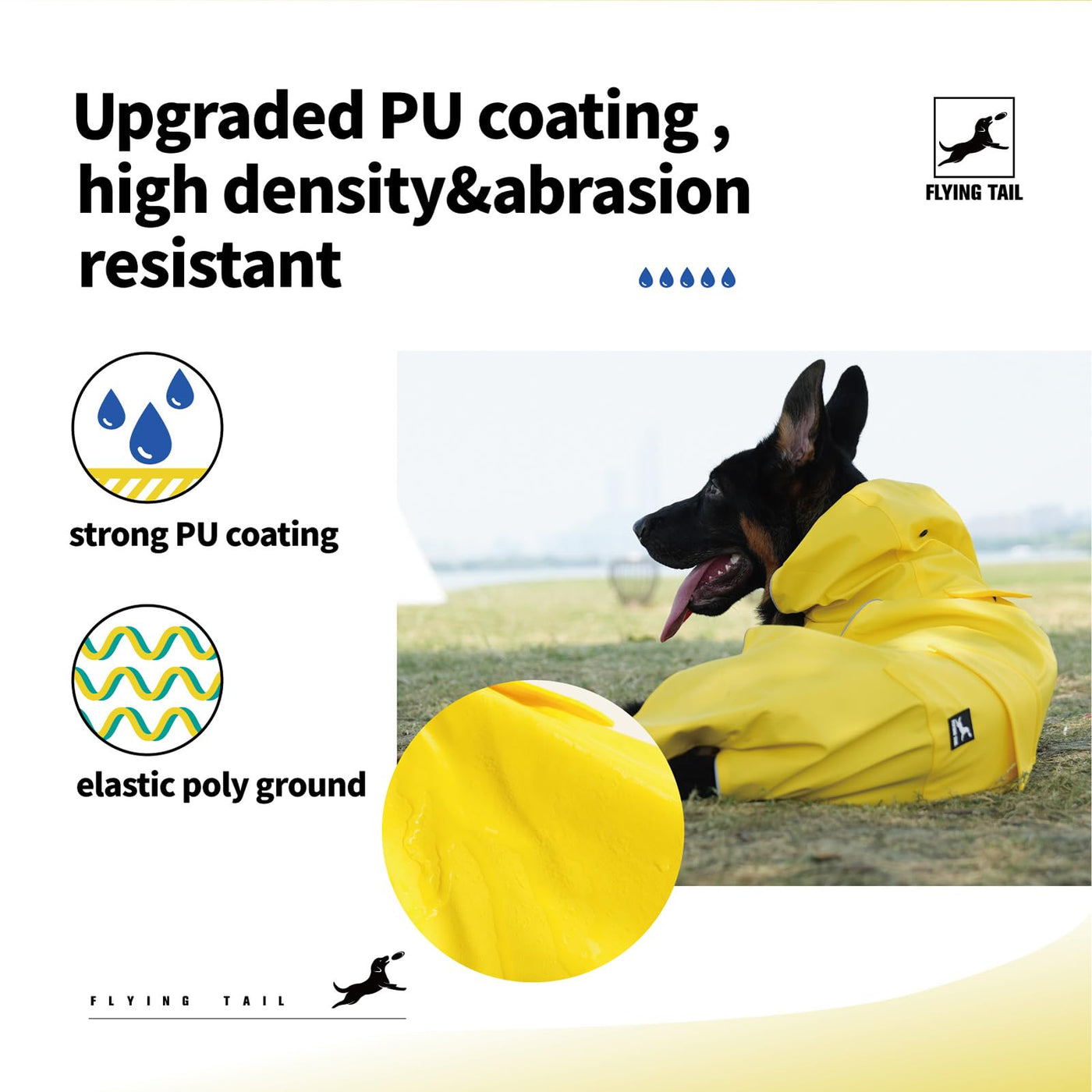 Flying Tail Raincoat ?Safety?High Quality Reflective Piping Around The Raincoat Can Ensure Your Pet Safety In Bad Weather Days. Easy To Use The Harness Since The Leash Hole Under Cover. ?Waterproof?100% Polyester Lightweight Fabric With Waterproof Coating Will Keep Your Pets Comfortable And Dry In The Rainy Days. ?Adjustable?Hook And Loop Can Easy To Adjust The Chest Girth To Fit Different Body Types. Neck Width Also Can Be Adjust With The Front Buttons. ?Easy To Wear?Adjustable Hook And Loop In The Front Of Chest Make It Dressed Quickly .Attached Functional Pocket On Back. ?Measurement?Please Carefully Check Girth In Size Chart Before Purchasing ?Easy To Clean&Pack?Easy To Wipe Up The Raincoat Surface With A Wrung Towel. This Lightweight Coat Can Be Easily Folded To Fit In To Car Storage Areas Or Duffel Bags.