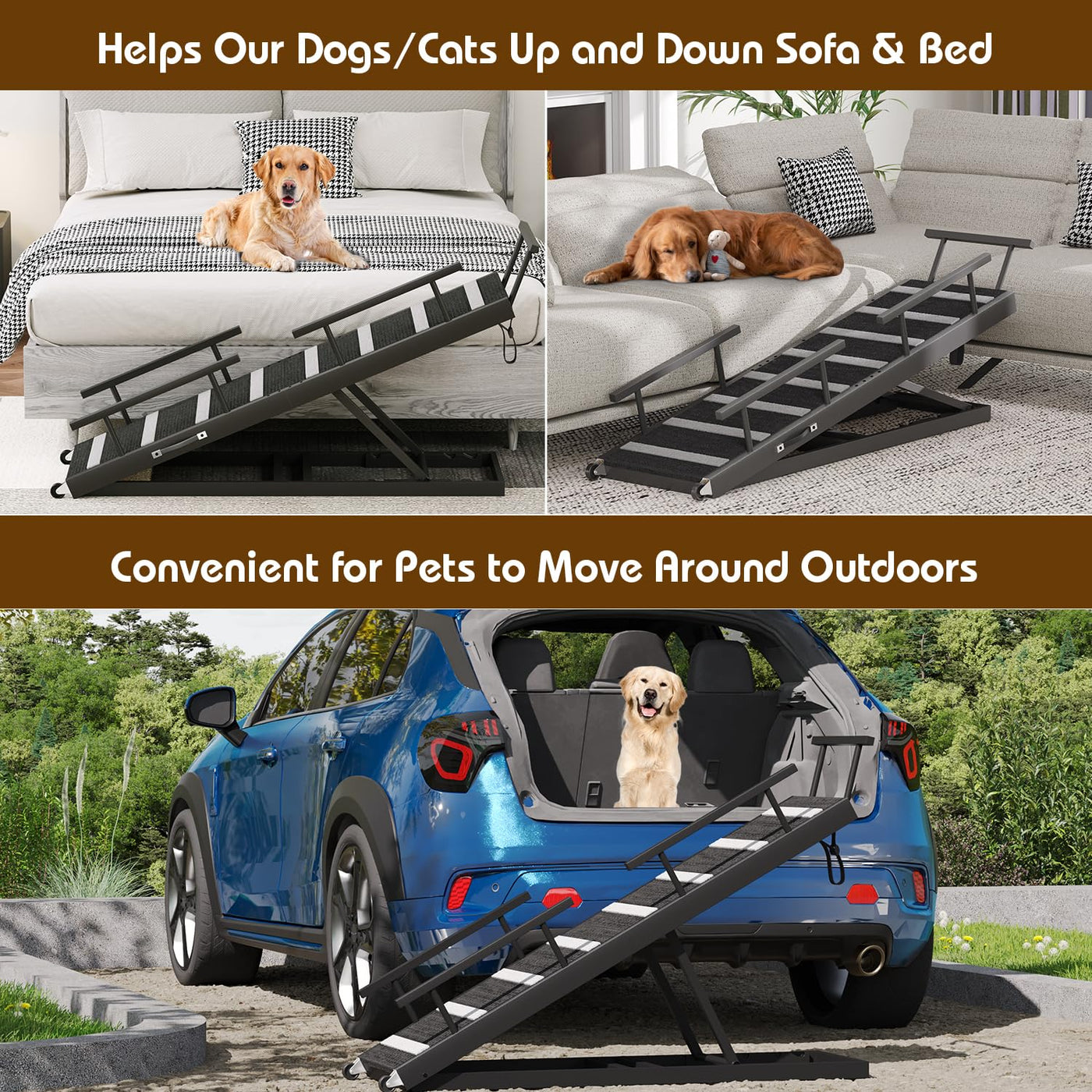 Features: 1. Metal Frame Construction More Stable And Solid. 2. The Side Of The Slope Has Added A Guardrail To Protect Your Dog. 3.Bottom Pulley Design, Easy To Move, Ideal For The Elderly Who Have Difficulty With Their Hands And Feet. 4. Anti-Slip Surface Providesultime Traction For Paws. Specification: Color: Black Material: Metal Frame + Wooden Board Size: 63 * 17.3 * 31.5In Package Weight: 29 Pounds Packing List: 1 * Bed Ramp For Dogs 2 * Metal Guardrail 1 * Instruction Manual