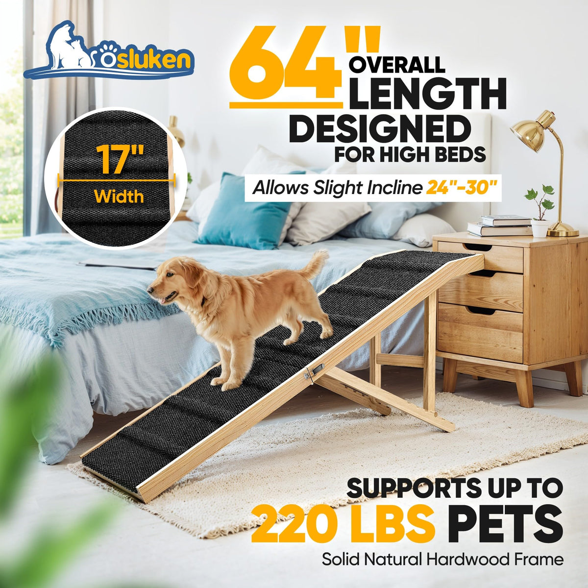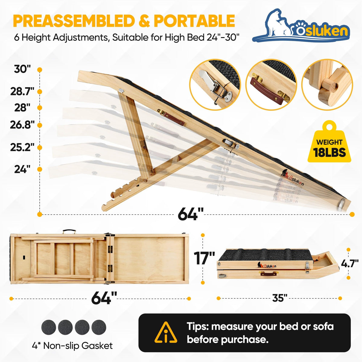 Why choose our dog ramp for bed? 64 Extended Length Landing Platform design on top Foldable Enough High 30 MAX 6 Adjustable Heights: 24 , 25.2 , 26.8 , 28 , 28.7, 30 Weight capacity: 220Lbs Other Features: Made of thicker solid wood Non-Slip Heavy-Duty Carpet High-Traction with 7 Raised Strips Dog ramp for pets :small dogs or cats, medium-sized dogs, large dogs, old dogs, etc. Unfolded Size: 64 x 1.7 Folded Size: 35 x 17 Attention to detail: Dog ramp with handles Stainless steel fittings and screws, Dog ramps for high beds, couch , sofa, cars , suv