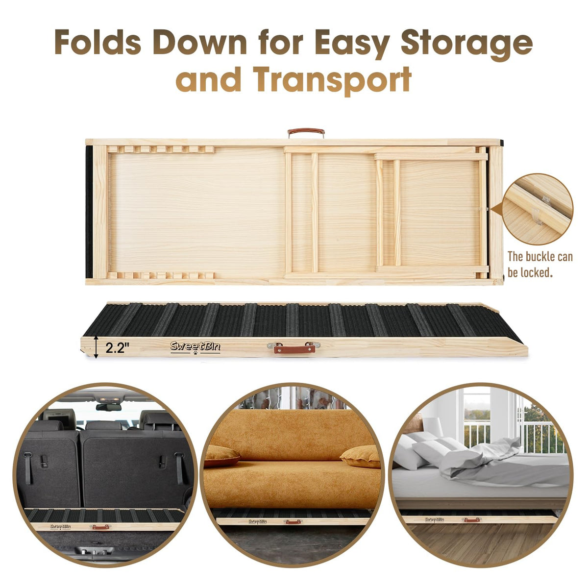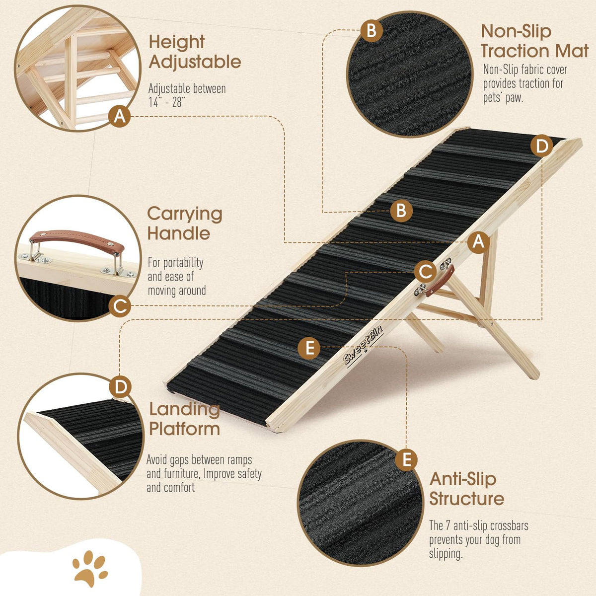 Sweetbin 4 Levels Height Adjustable Portable Pet Ramp Is An Attractive Way To Help Pets Reach Their Favorite Places. For The Elderly Or Arthritic Pet, Sweetbin Pet Ramps With Gentle Climbing Angles Are An Ideal Solution ? Perfect For Helping Pet Reach The Car, Bed, Couch Or Other Favorite Places ? Self-Supporting, It Do Not Need To Be Attached To The Vehicle Or Furniture ? Ideal For Older Or Arthritic Pets ? Folds Down For Easy Storage ? No Assembly Required Features: ? Product Name: Pet Ramp ? Four-Layer Adjustable Height: 10, 13, 16 And 19 Inches ? Folding Size: 35'' L X 14'' W X 2.6'' H ? Weight Capacity: 110Lb ? Material: Solid Wood, Fabric Our Guarantee: We Are Totally Obsessive About Quality And Customer Service - If You Have Any Questions Please Get In Touch And We Will Do Everything We Can To Solve Them. Wish You A Pleasant Shopping Experience In Our Store!
