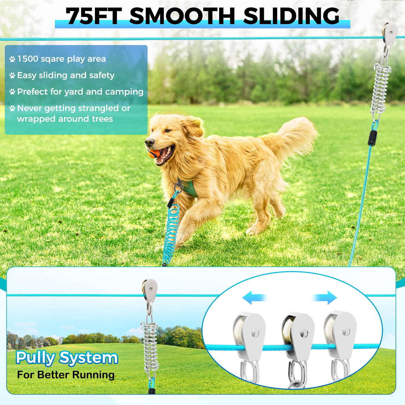 Dog Runner for Yard, Double Shock Absorption Dog Trolley System for Large Dogs, Heavy Duty 75FT Dog Tie Out Run Cable with 10FT