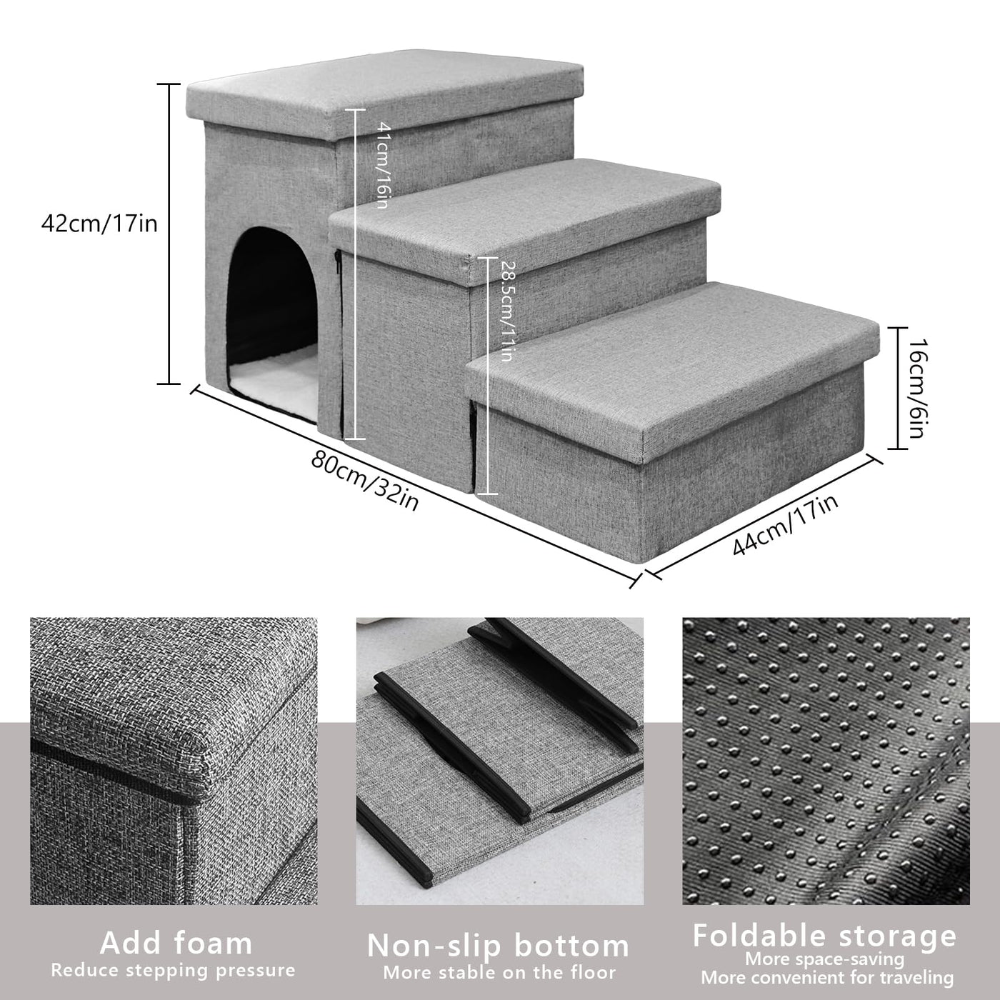 Dog Stairs For High Bed 18'' H,Foldable Pet Stairs For Small Medium Or Large Dogs Puppy With Storage For Bed Or Couch, 3-Step Ca