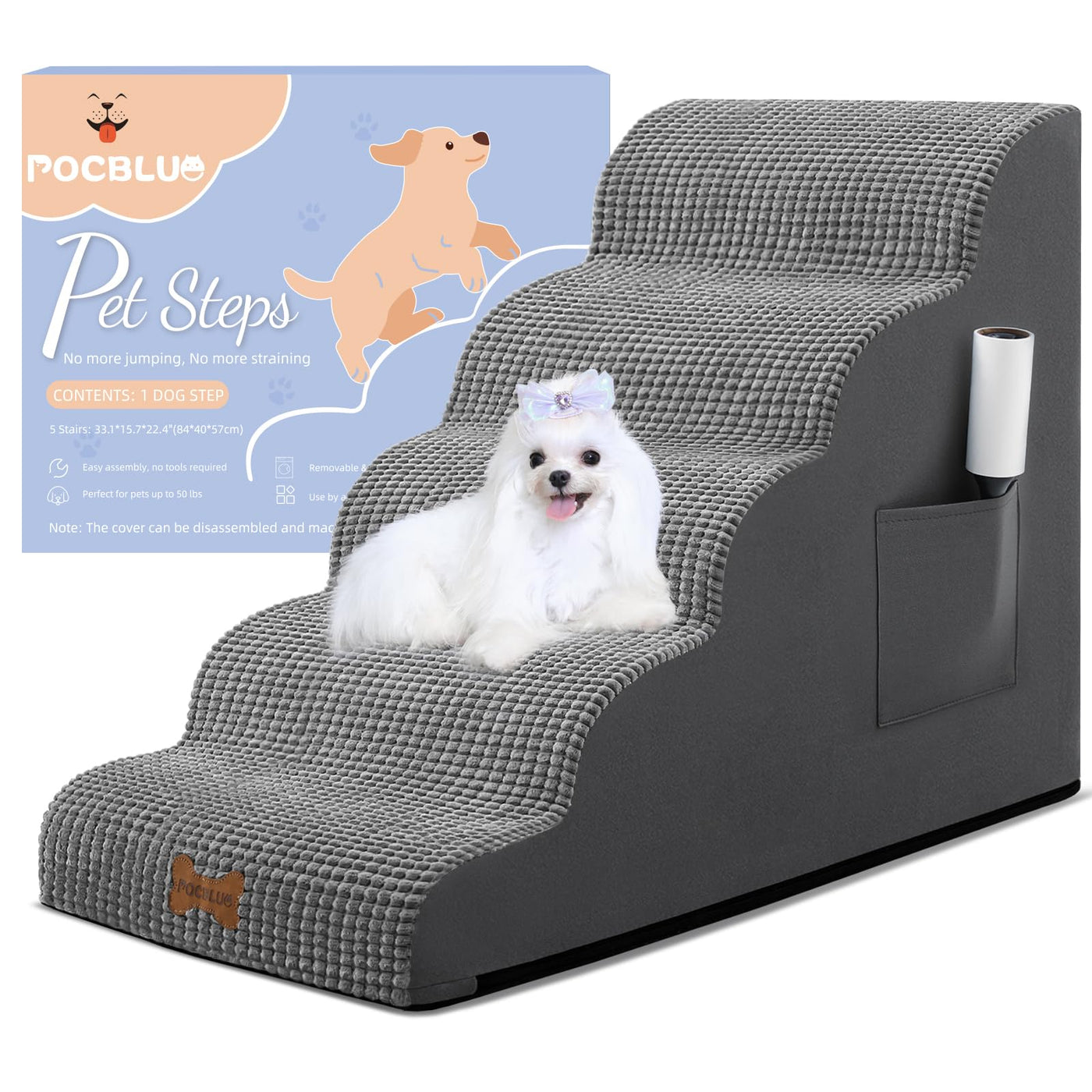 Dog Stairs For Small Dogs, Wide Pet Step With Removable Cover, No Assembly High Density Foam Cat Ramp For Bed Or Sofa, 5-Step, D