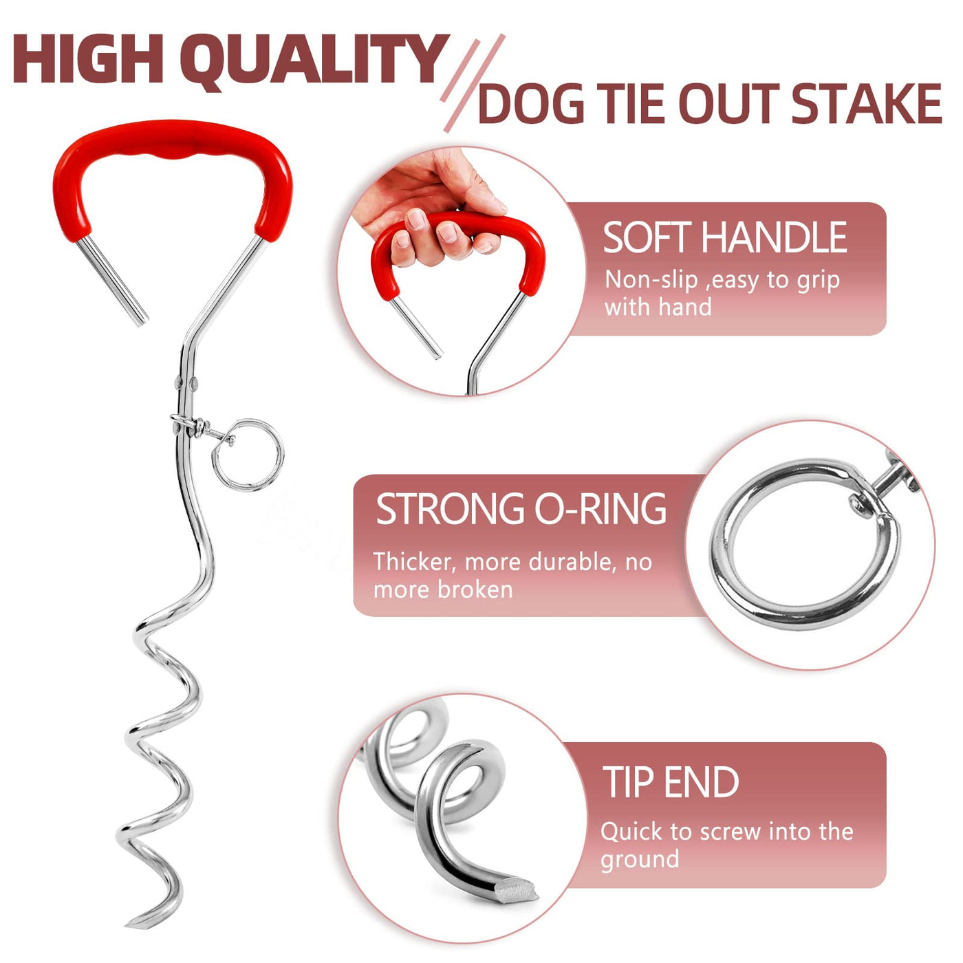 By dog lovers, for dog lovers! Dogs are always full of energy, especially in parks, beaches, forests, camping, adventures, and outdoor activities. But when we are outdoors and we have to leave our dogs for some minutes, and we want them to stay in the location to wait us back. Or when we fish by the lake, cook in the forest, build tents in the wild, or sun bathe on the beach, they may not be sitting with us, when we don't pay attention, they may get lost in the wild. So you just need a long and strong dog lead spike cable to keep your dog's range of activities or the safety of people around. A trusty anchor to keep pets safe and secure with Snagle Paw tie out cable and stake combo! Product Features 1. Domed style handle prevents unsafe protruding from ground and allows for easy installment 2.Corkscrew style and durable double-welded steel stake keep stake securely in place 3. 360-degree swivel ring allows for wider roaming without tangling 4. 30ft Galvanized steel leash is coated with crack-resistant poly vinyl to stay strong against pulling, weatherproof chrome-plated coating to prevent rust, and easy to clean. 5, Comes with a thoughtful sturdy oxford carry bag for easy storage