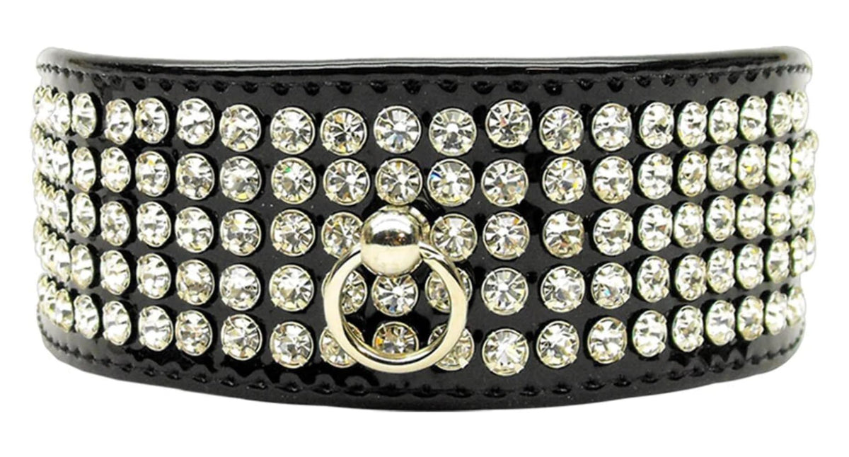 Dog Puppy &Amp; Pet Collar ''Patent Five Row Clear Crystal''We Love The Jewels On This Dog Collar! This 1 '' Wide Glistening Patent Faux Leather Crystal Collar Is Jeweled With Five Rows Of Sparkling Clear Crystals And A Center Post For A Pet I.D. Tag.Be Sure To Reference Our Sizing Chart To Get The Perfect Fit For Your Dog! If Your Pet'S Neck Falls On The Line Between Sizes On Our Chart Choose The Larger One!Thank You So Much For Your Interest In Our Handmade High Quality Dog And Cat Collars And Leashes We Hope You'Ll Love Them! ??