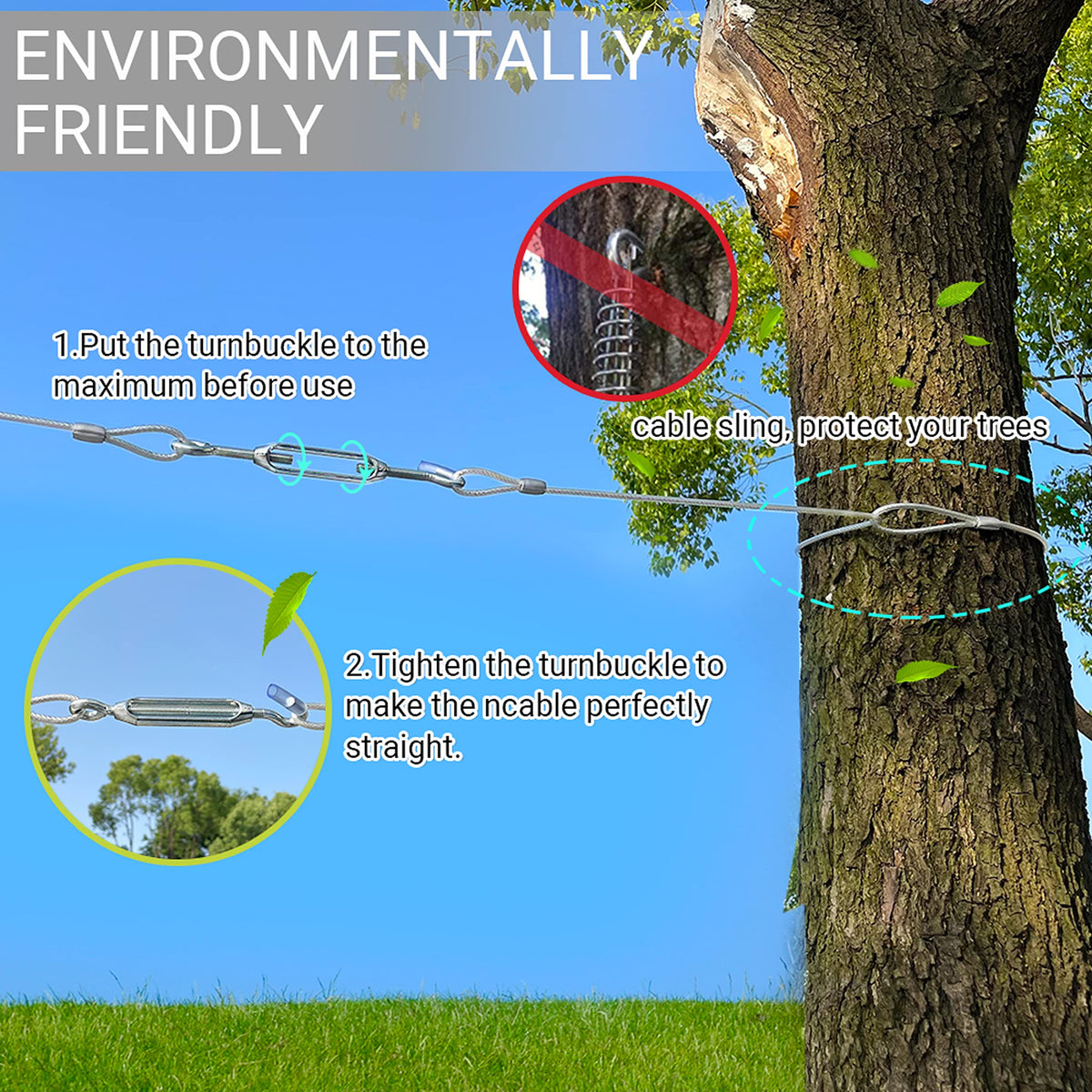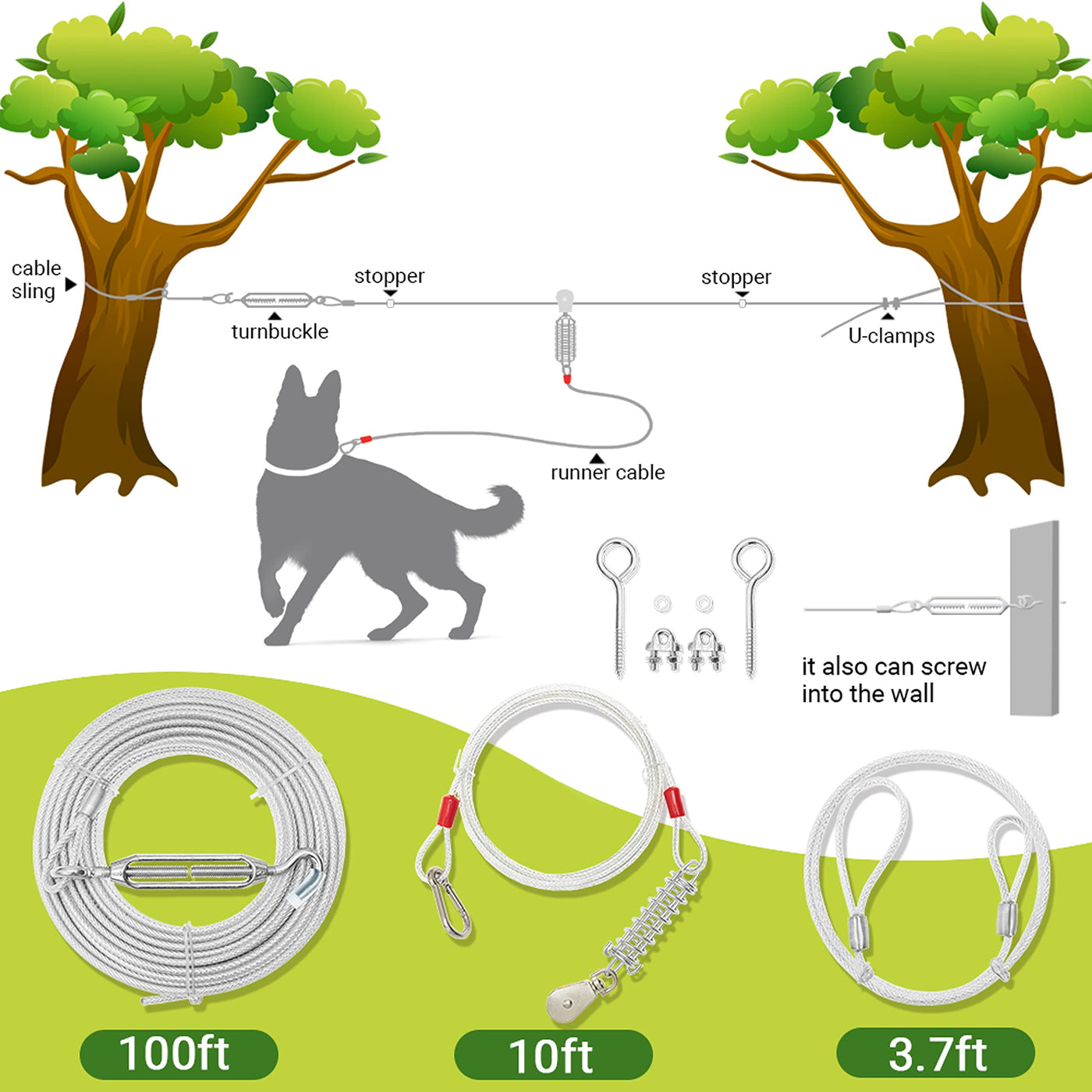 This 100ft dog cable can prevent dogs from accidentally getting lost in the wild, garden, courtyard and other outdoor areas. You can install it between trees using a cable sling (which won't hurt the trees), or use screw hooks to drive into walls and other places where it can be fastened. Meet the needs of dogs for running and playing. You can use it for dog training, behavior modification, chase circuit games and more. etc.