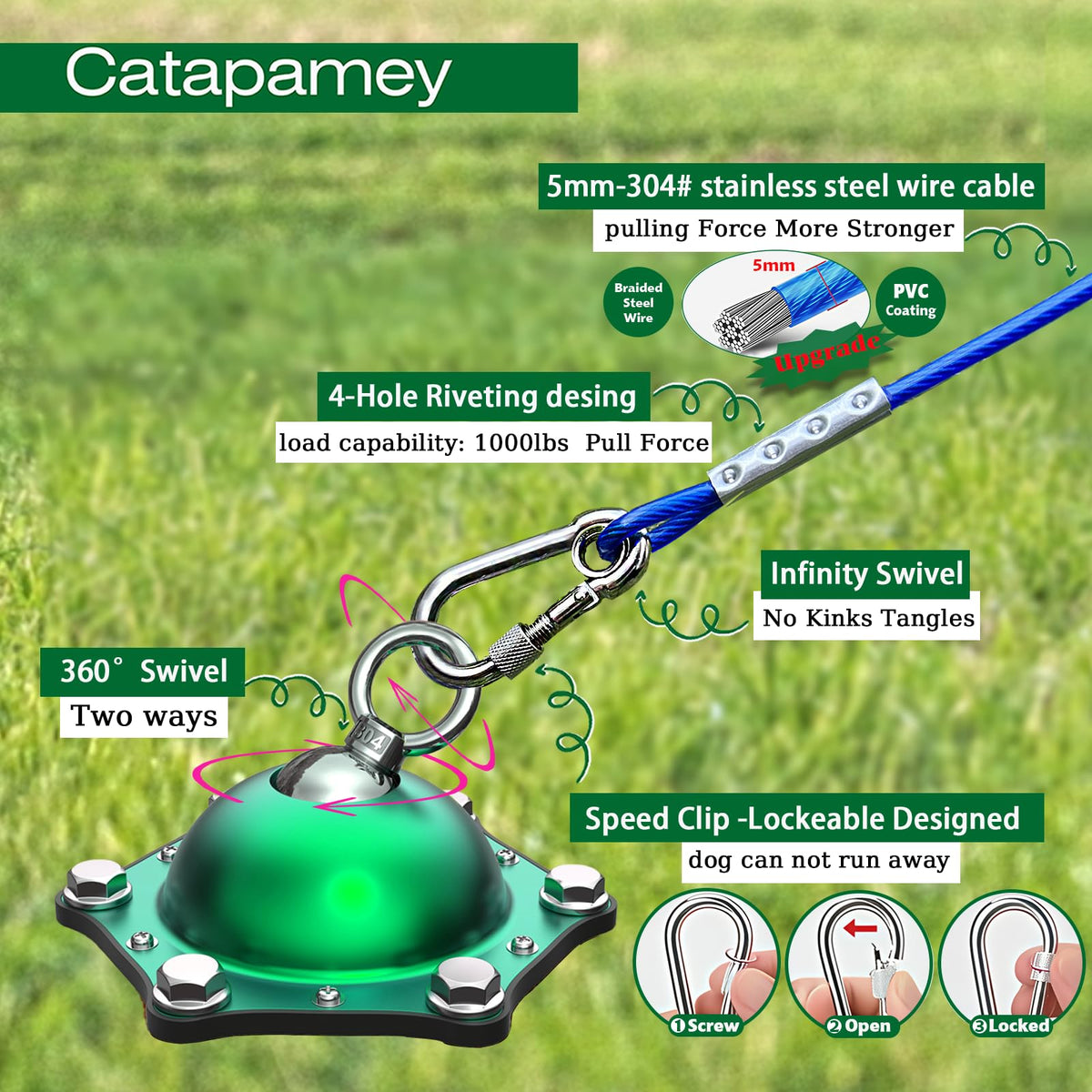 Dog Tie Out Cable and Stake for Yard,(up to 200lbs) 360Swivel Run Anchors- No Tangle,with 30FT Heavy Duty Tie Out Cable for Dogs