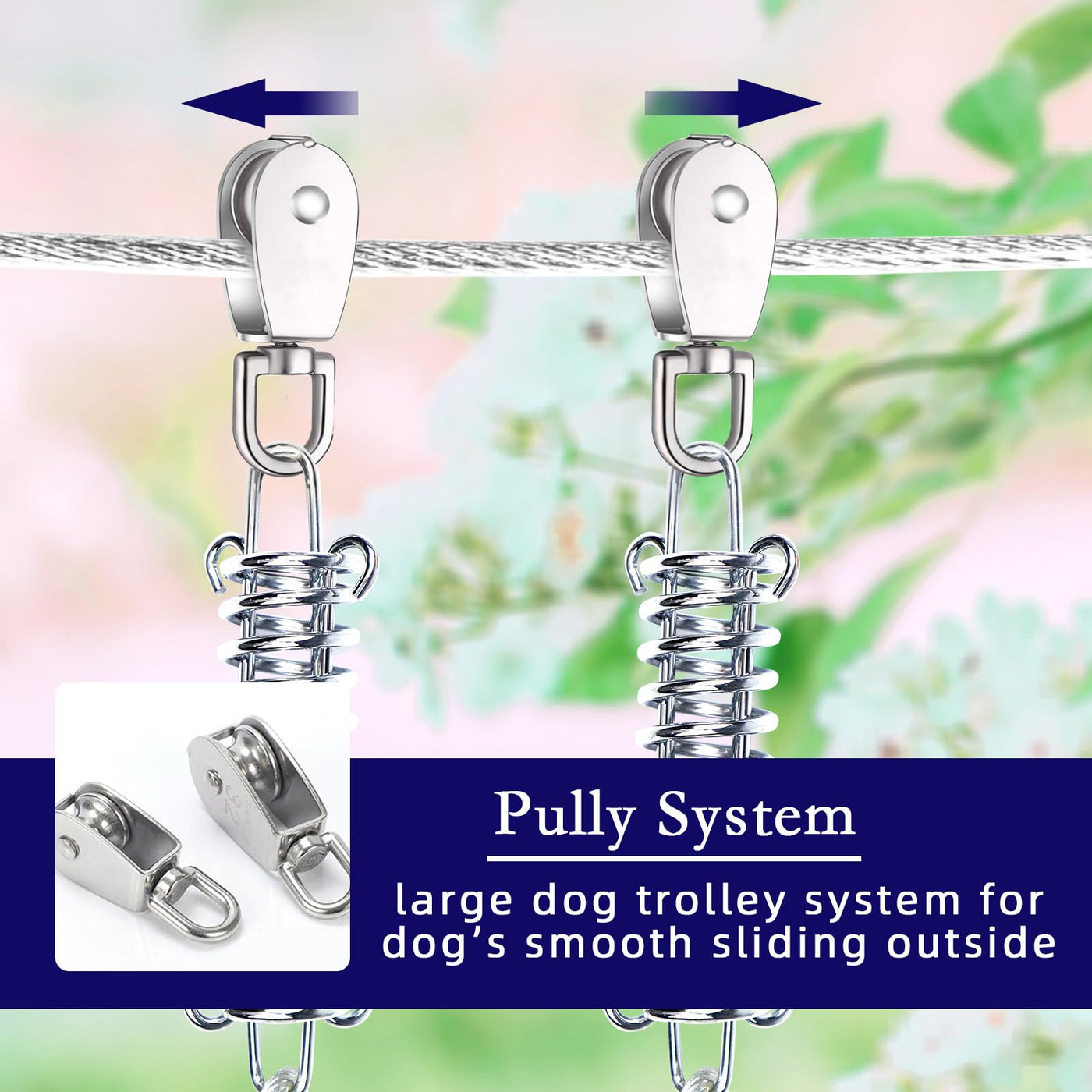HEAVY DUTY DOg TIE OUT cABLE: The Aerial Run Trolley System comes with a 50 ft dog tie out cable and a 10ft dog runner zipline which are vinyl covered to protect from rain and rust durable and long lasting for large dogs up to 125 lbs Turnbuckle is included to avoid sagging and help pulley run smoothly along the cable ANTI-SHOcK DOg RUNNER LINE:The shock absorbing spring is located on the runner lead instead of the cable help your dog reduce the tension more directly to avoid injury give your pet more freedom and securityAto run in the yard AVIATION ALUMINUM cARABINER cLIPS:The 360Atangle free clips is made of top quality rust-free aviation aluminum which is very lightweight give dogs more ease but also durable enough to withstand the most intense pulling The rotation tightening technology prevent loosing off when dog running and playing KEEP YOUR DOg SAFE:This dog aerial tie out cable is sturdy with how well its holding up to dogs running and pulling to keep them safely in sight Free your hand without the fear of them running off when camping EASY TO INSTALL: Our Snagle Paw dog trolley zipline tie out cable comes with all components needed for a fast and easy 1 person set up also a detailed Installation Instructions if you have any concerns just feel free to contact us we will help you to solve your problem within 24 hours
