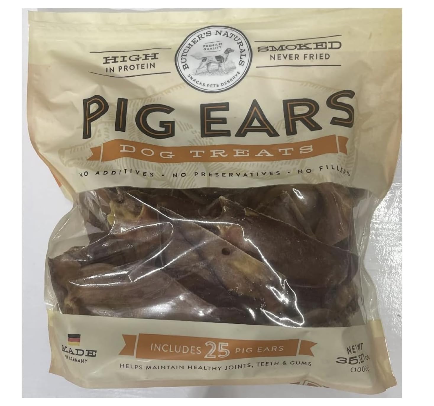 The Butchers Naturals Dry Pig Ears Treats for Dogs, 10 Pieces are single-sourced, exclusively from food- grade manufacturers in Germany. Our treats are scientifically formulated to ensure the proper amount of nutrition is in each item to help supplement your pets balanced and healthy diet. Our Pig ears are 100% Pig. Your dog will do anything for these tempting, Pig Ears treats. Our Pig Ears are slow roasted and naturally smoked. When your furry companion has been good, or you just want to show your pet some love, your dog will all but beg for these Butchers Naturals Pig Ears Treats. All our recipes are clean - keeping our food free from artificial ingredients and unnecessary additives or preservatives. They are free of corn, wheat, and soy, so you can be assured your pet is getting only the best, pure ingredients for your high-quality standards and his safety. Our treats are slow roasted to lock in the flavor, so each treat tastes scrumptious for your furry friend. Your pet is your best friend, and they deserve the best you can give them.