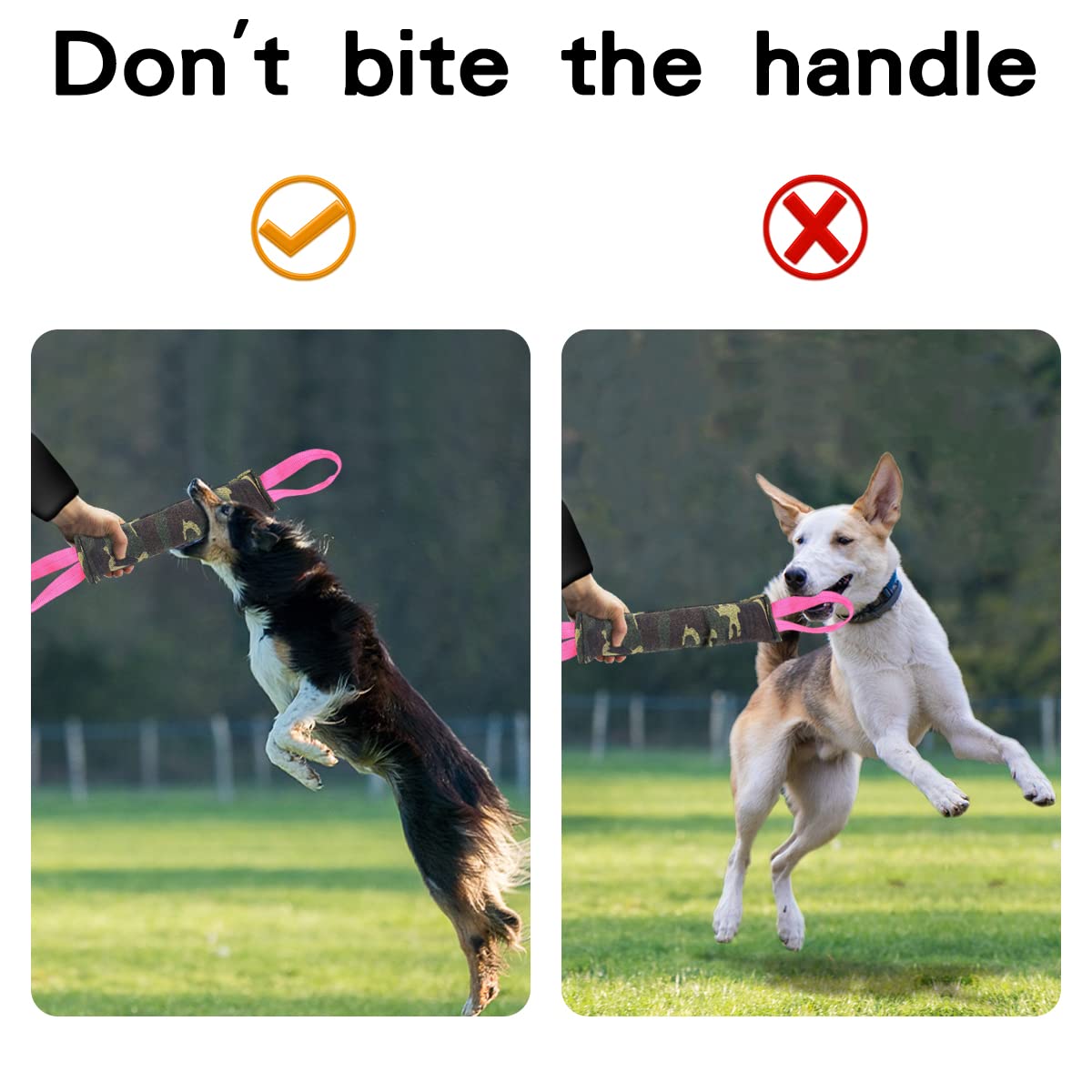 Q: What safety precautions should I take when using this tug toy?A: Always ensure your dog is biting the pillow portion of the toy, not the handles. Use caution while pulling and protect your hands for a safe play experience.