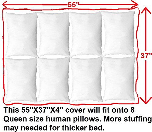 Q: What are the dimensions of the Dogbed4less DIY Pet Bed Pillow Cover?A: The Dogbed4less DIY Pet Bed Pillow Cover is designed to fit a pet bed measuring 55"X37"X4". This size is ideal for large dogs or may also accommodate human queen size pillows.