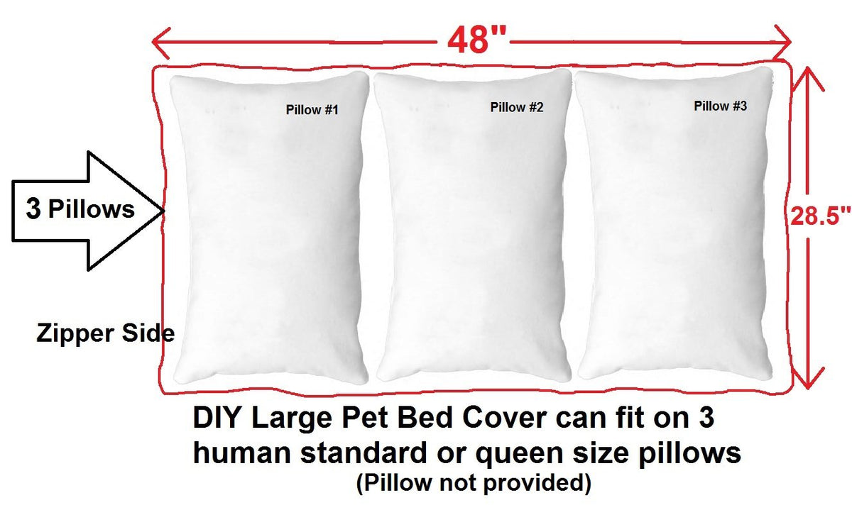 Q: What size pillows fit the Dogbed4less pet bed cover?A: The Dogbed4less pet bed cover is designed to fit on 3 regular or queen-size human bed pillows, providing ample space for your pet to rest comfortably.