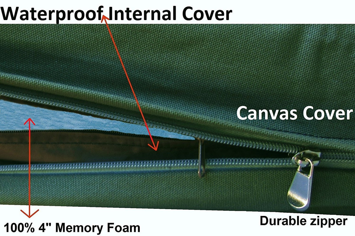 The order comes with 1 durable canvas cover in olive green color, 1 waterproof internal zippered cover and 1 solid 4 inches gel-infused memory foam insert pad. 55' Length X 47' Width X 4' Thick is ideal for larger breed dogs.
