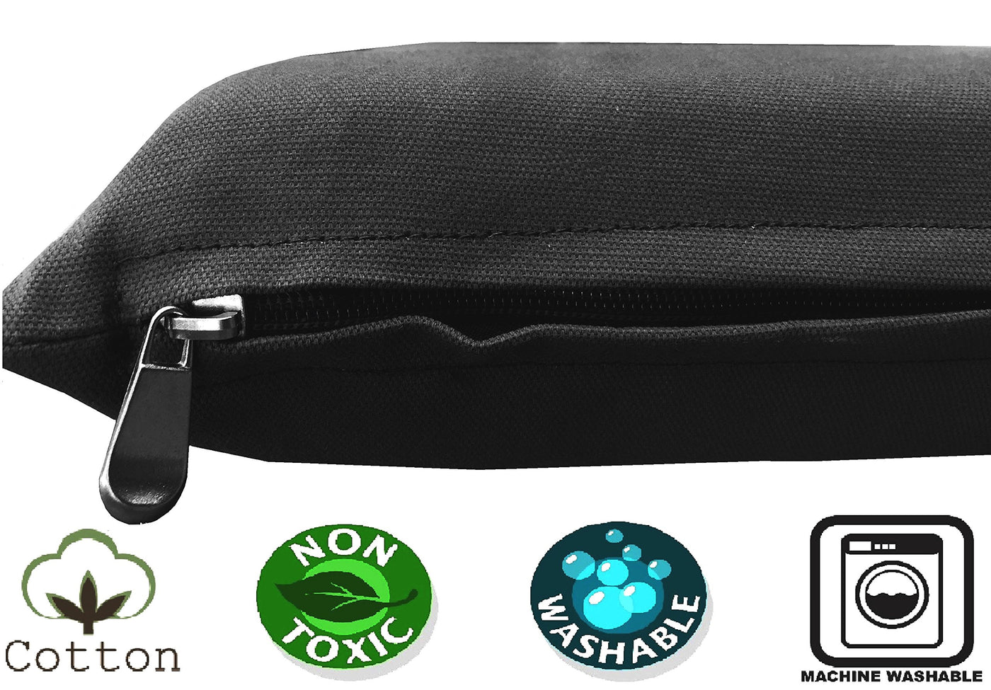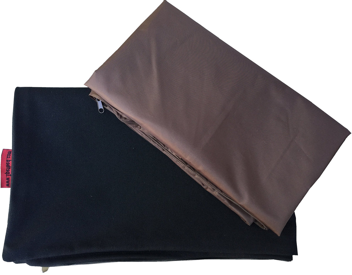 2 excellent layers of fabric covers: Internal layer waterproof fabric zipper cover to help secure the pad and a durable canvas fabric external zipper cover (36'X29' Flat size) for easy cleaning and maintenance. Our external canvas cover is 100% cotton made which is interchangeable for the top or bottom side and great for pets that are allergic to synthetic fabrics. The external cover is machine washable and dry-able.