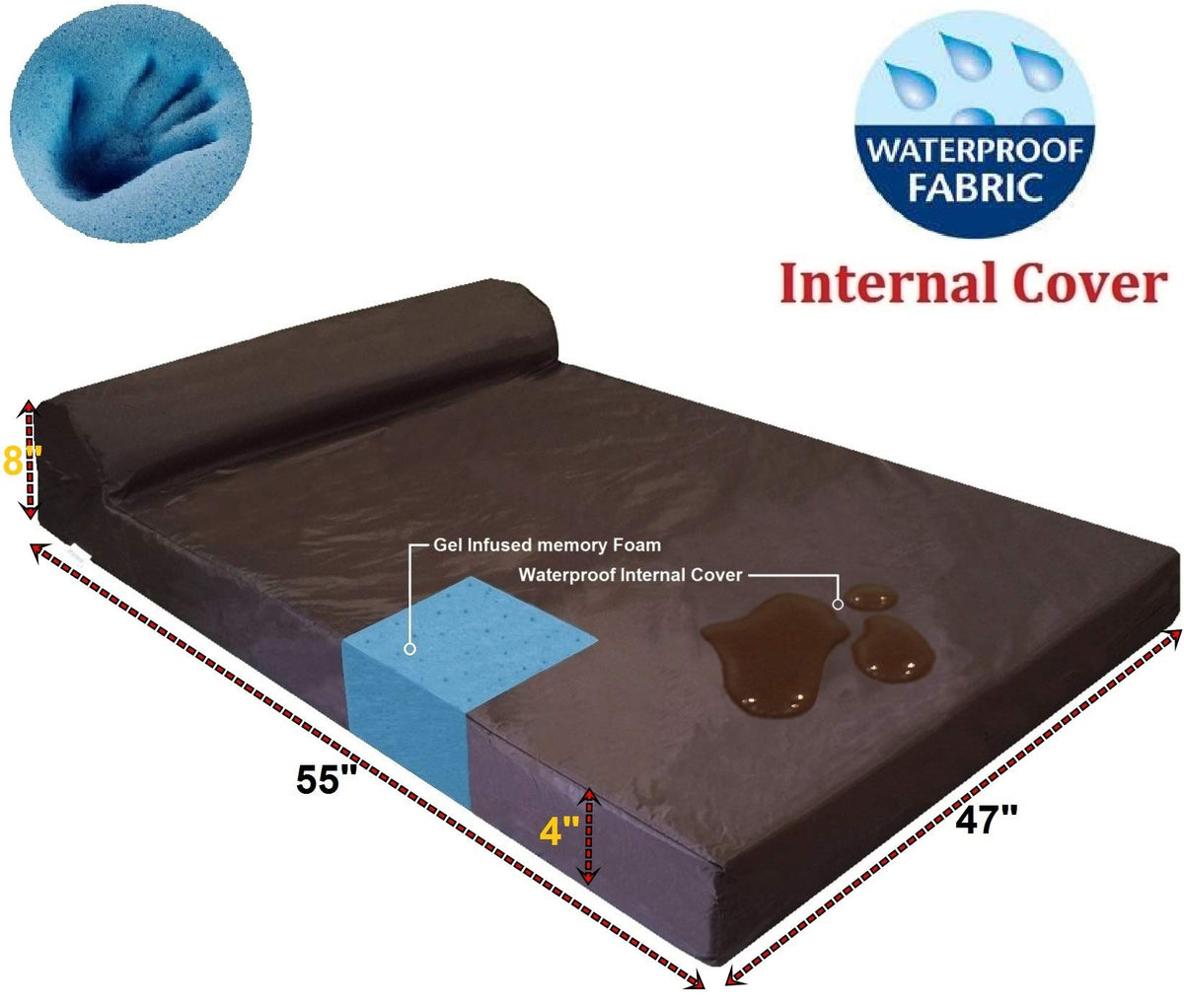 55' Length X 47' Width with headrest pillow bed is excellent for Larger breed dogs. PAY 30% to 60% LESS than retail price. The bed comes with 1 external MicroSuede zippered cover in brown color, 1 waterproof internal zippered cover and 1 solid 100% 4 inches gel memory foam pad with total of 8' thickness headrest on the side.