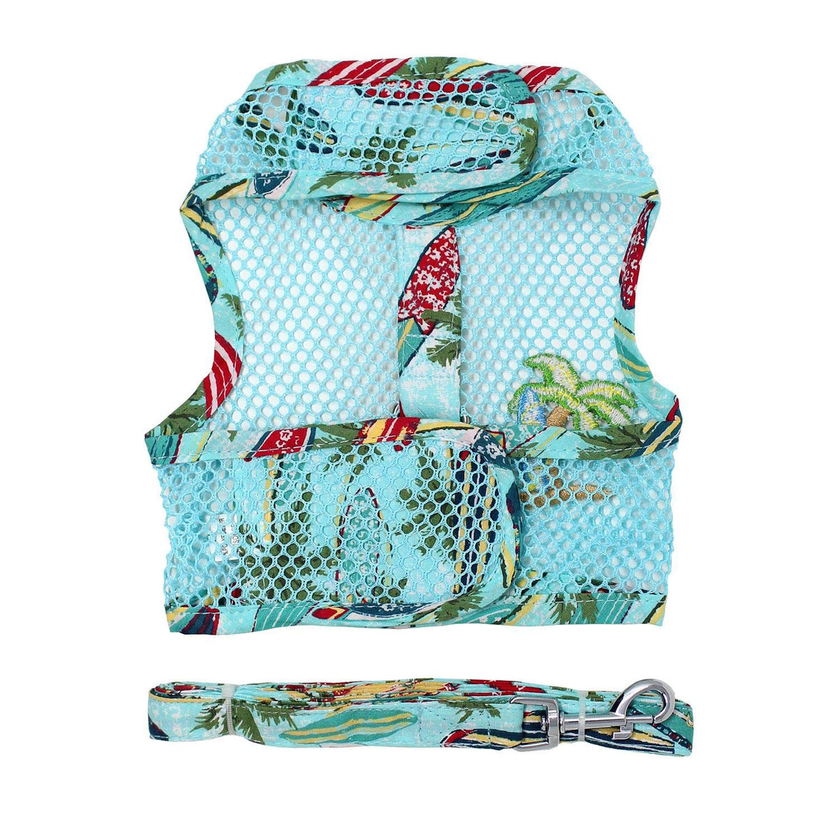 This Surfboards And Palms Cool Mesh Harness By Doggie Design Will Help Your Pup Beat The Dog Days Of Summer By Staying Cool With This Breathable Breezy Style Our Cool Mesh Dog Harnesses Feature Soft-But-Strong Wide Gauge Mesh Accented By Summer-Themed Embroidered Patches This Harness Is Particularly Fun With A Stylish Surfboard And Palm Tree Design Thats Paired With A Matching Fabric Trim To Make Sure Your Pup Is Outfitted From Head To Paw, This Adorable Harness Includes A Matching Leash Style Doesnt Take A Back Seat To Safety, Though Even Though The Mesh Seems Lightweight To Keep Your Pup From Overheating, It Is Surprisingly Durable For Being So Soft Additionally, The Welded D-Ring Has Been Reinforced With A Sturdy Double Box Stitch Heavy-Duty Touch Fastener At The Neck And Chest Provides Strength And A Nice Amount Of Adjustability Keep In Mind That As The Mesh Is Very Flexible, You Might Want To Choose A Slightly More Snug Size If Your Pup Is Measuring Between Sizes For Added Security Do Factor In Coat Fluffiness Too Care: Hand Wash, Dry Flat Be Sure To Capture All Of Your Spring And Summer Adventures And Send In Your Photos Sizing Information: X-Small: Chest 10-13 Neck 7-10 - Pets Weighting 3-5Lbs Small: Chest 13-16 Neck 10-13 - Pets Weighting 6-10Lbs Medium: Chest 16-19 Neck 13-16 - Pets Weighting 11-15Lbs Large: Chest 19-21 Neck 16-19 - Pets Weighting 15-20Lbs