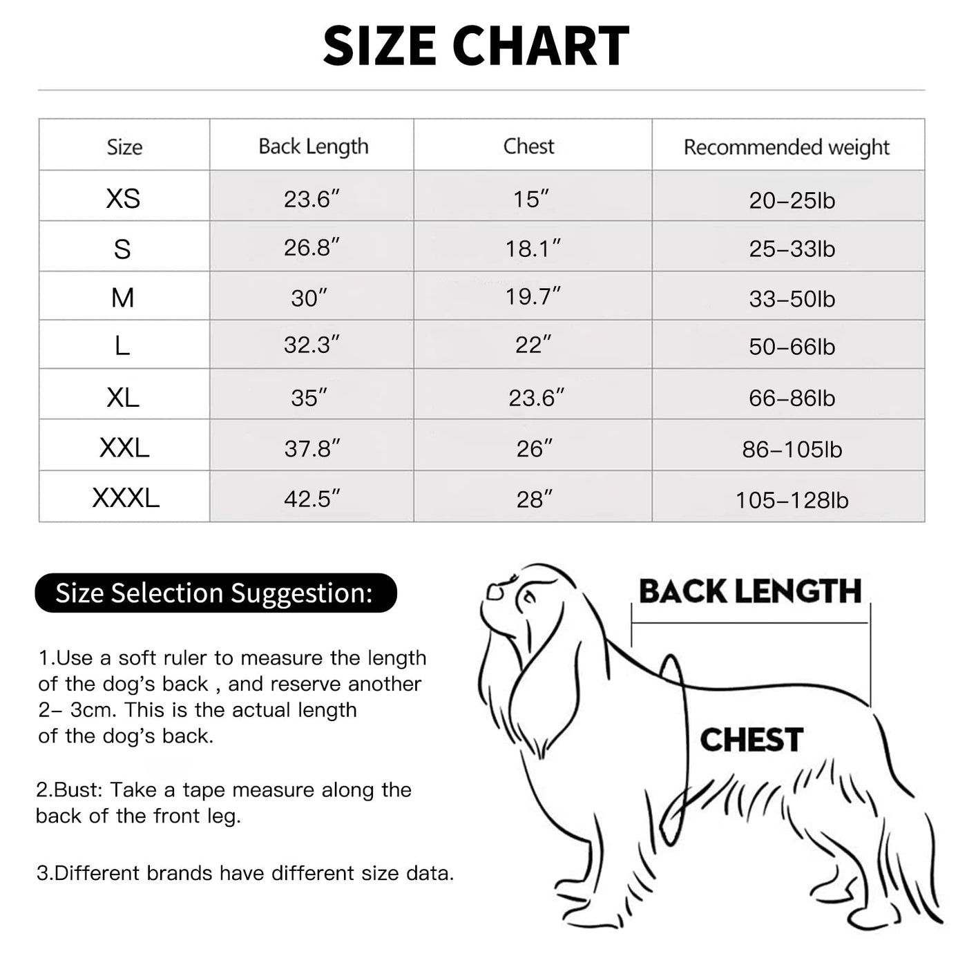 ??Size: To make the dog pajamas fit your dog's body better. Please measure your dog's neck back and chest before purchasing and use your pet's bust as the purchasing size standard. If your dog's measurements are between two sizes choose the larger size.This dog sweater is suitable for small medium and large dogs