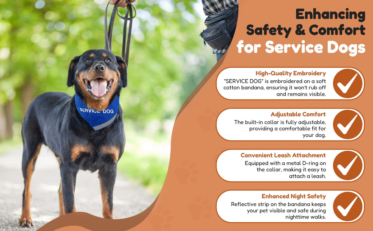 The Doggie Stylz Service Dog Bandana Is Embroidered With 'Service Dog'. The Reflective Strip Is For Pet Safety At Night. This Design Quickly Addresses And Solves Common Problems With A Service Dog. Lets The Public Know Your Dog Is Working. Built In Matching Collar To Keep Bandana Secure. Comes With Metal Ring To Attach Leash. This Dog Harness No Pull Was Designed By Doggie Stylz With Your Convenience And Your Dogs Safety In In Mind. Make Your Public Outings Or Dog Training Much More Enjoyable For Everyone. Our Mobility Service Dog Harness Lets Strangers Know Immediately Your Dog Is Working And Will Prevent Them From Approaching Your Service Dog Animal. The Doggie Stylz Working Dog Vest Feature Reflective Straps, Piping And Removable Hook And Loop Patches Which Provide Excellent Nighttime Visibility To Keep Your Safe. The Handle On Top Gives Handler Extra Control In All Situations. It Is Designed With Durable Nylon Adjustable Straps. The Underside Is Made Of Neoprene Which Adds Reinforcement And Guards Against Abrasions Like Few Materials Do. A Stainless-Steel Heave Duty D-Ring Is Centrally Located On Top Of The Harness Which Makes It Great No Pull Harness And Prevents Choking. The D-Ring Is Easy For Attaching Your Dog Leash Or Dog Tag. The Entire Service Dog Mobility Harness Is Double Stitched To Add Strength For All Activities. Two Adjustable Straps To Assure Custom Fit Specifically For Your Dog. The Easy Snap Release Buckle Makes This Harness The Easiest To Put On And Take Off On The Market.