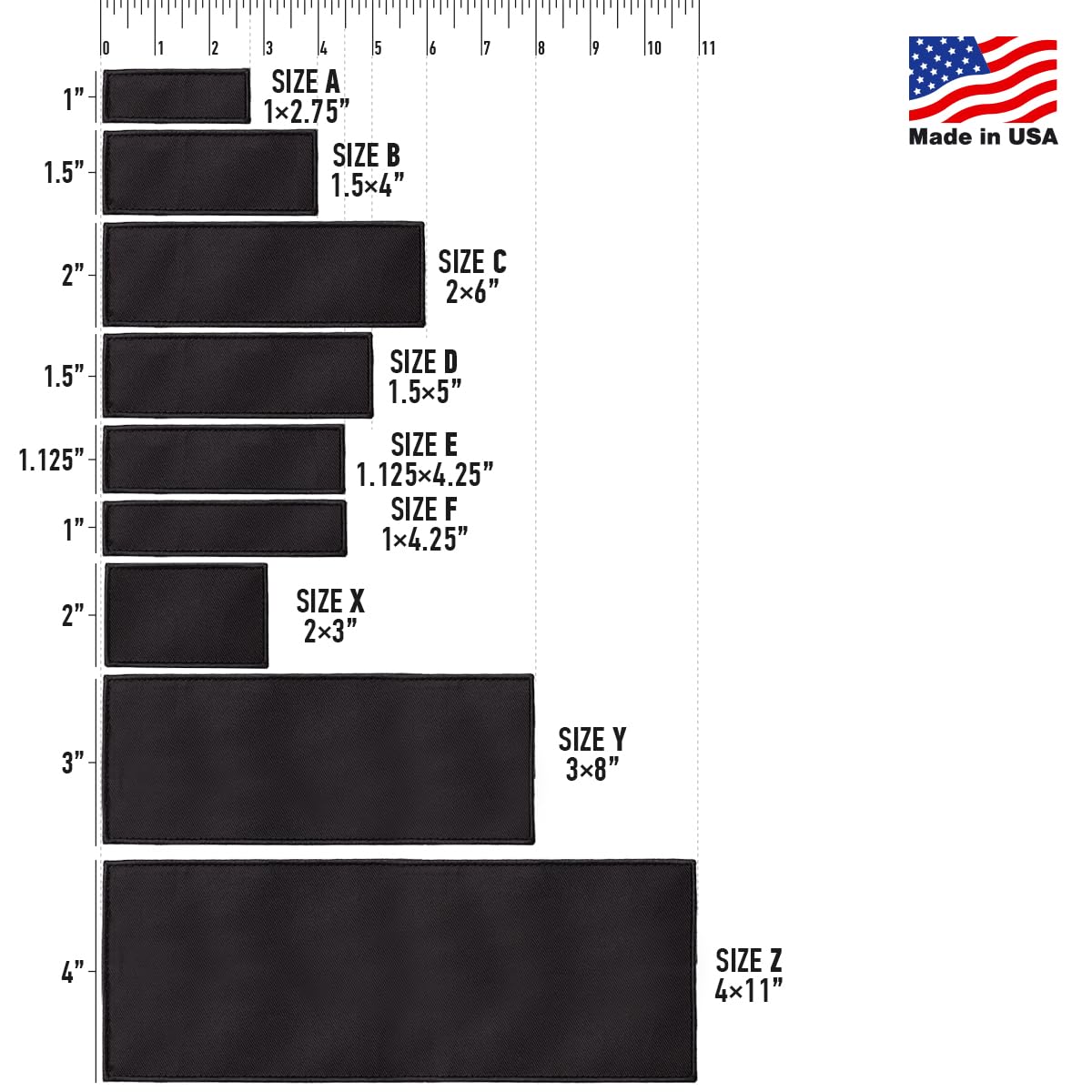 Q: What sizes are available for the Dogline Custom Bright White Text Patch?A: The Dogline Custom Bright White Text Patch is available in nine sizes: Size A - 1" x 2.75", Size B - 1.5" x 4", Size C - 2" x 6", Size D - 1.5" x 5", Size E - 1.125" x 4.25", Size F - 1" x 4.25", Size X - 3" x 2", Size Y - 3" x 8", and Size Z - 4" x 11".