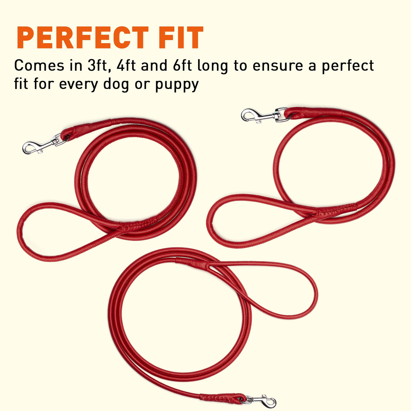 Q: What sizes are available for the Dogline Rolled Leather Dog Leash?A: The Dogline Rolled Leather Dog Leash is available in multiple sizes: three, four, and six-foot lengths, with three different widths to accommodate small, medium, and large breeds.