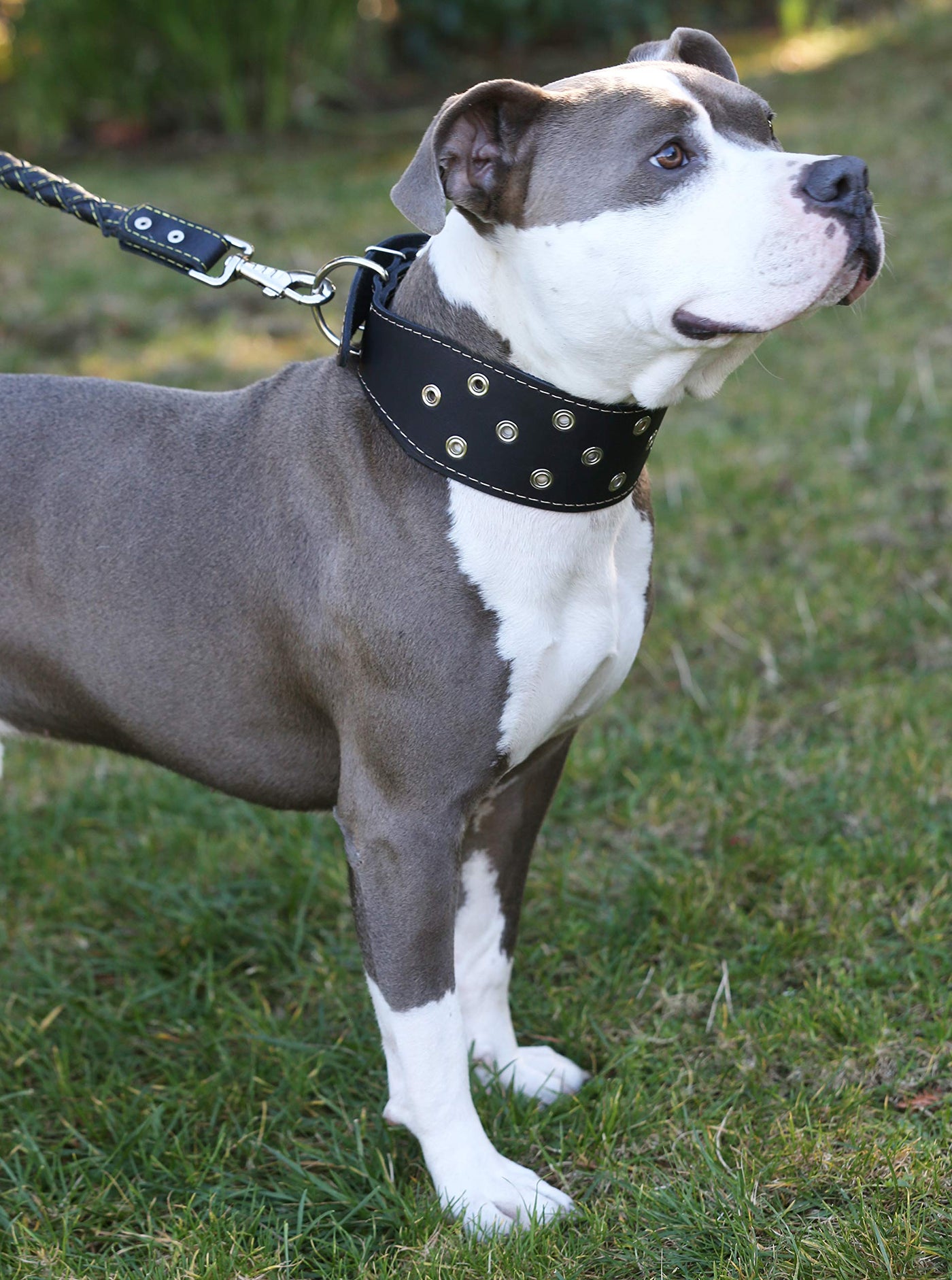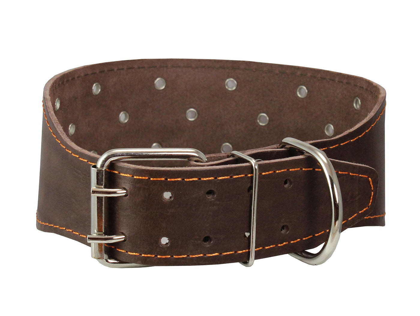 Made of real leather this heavy duty 3" wide dog collar tapers to 1.75" wide at the buckle for easy buckling .It can be used for all kinds of activities like walking training. Decorated with metal enforced eyelets. Trimmed with thick waxed thread.