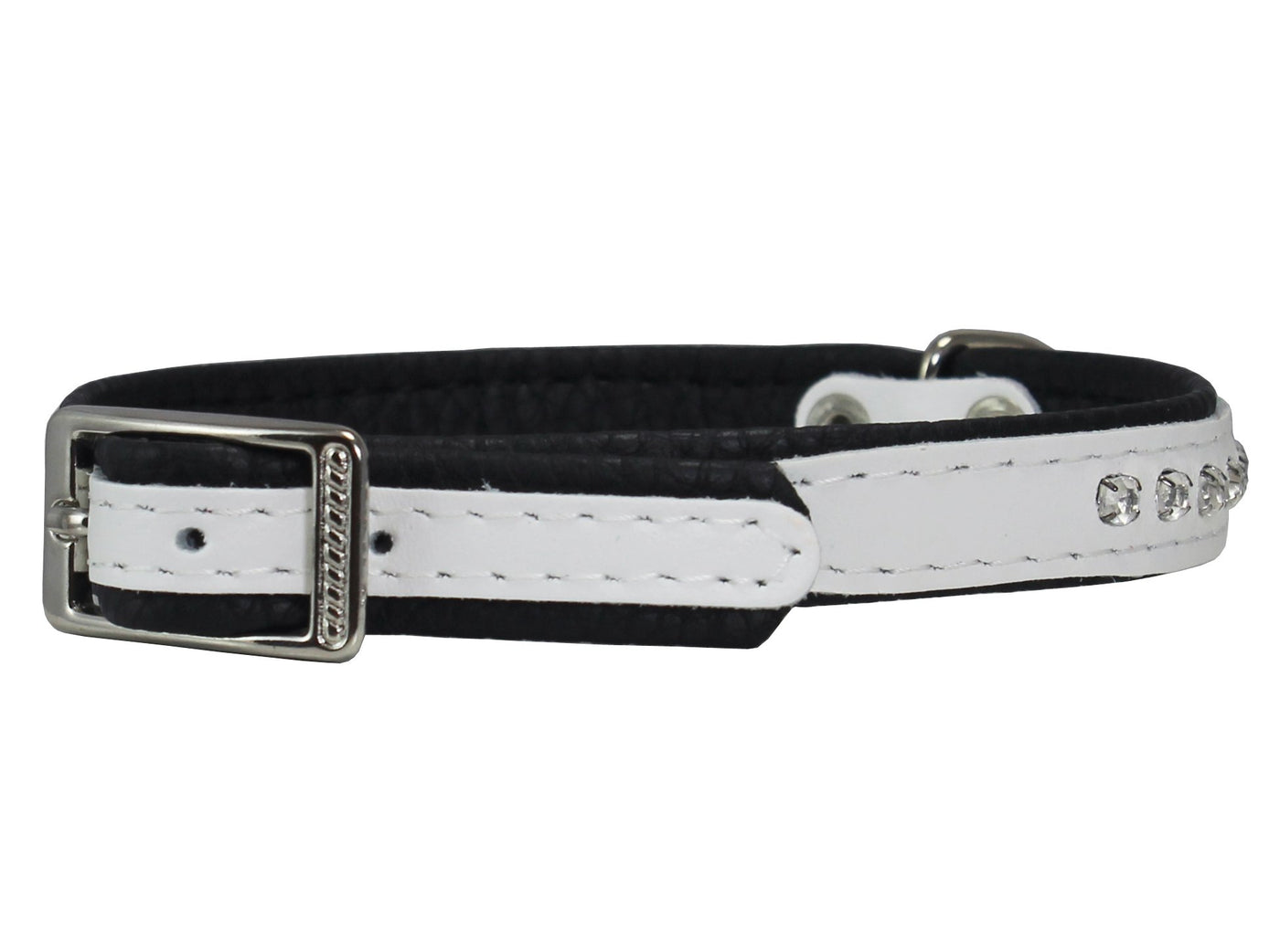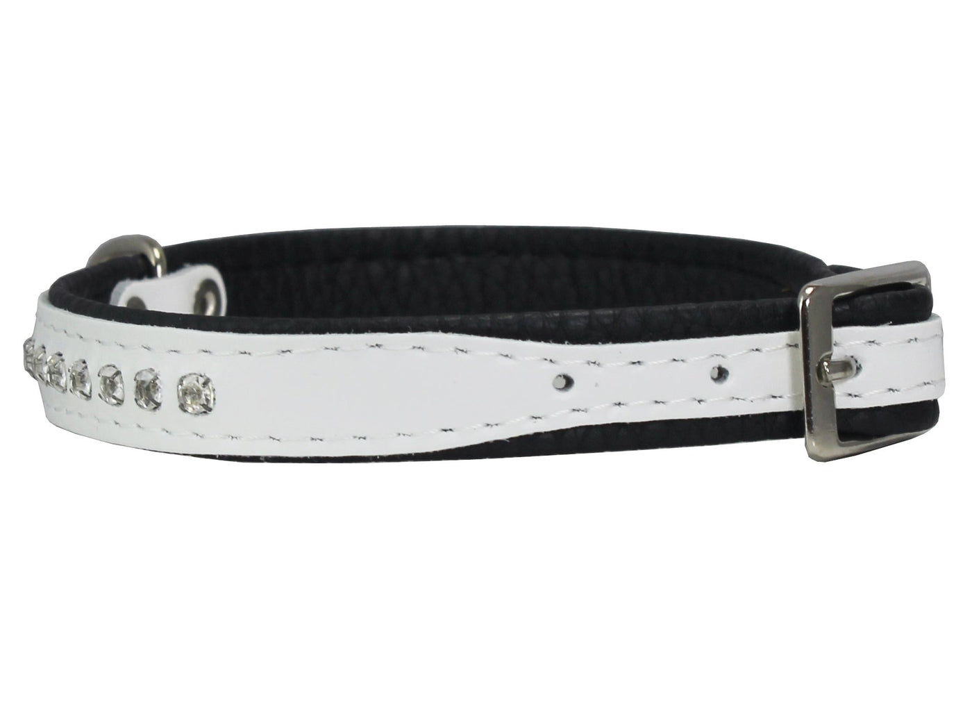 Gorgeous high quality dog collar. Pliable and strong, trimmed with thick waxed thread. Top surface made of high quality 100% genuine leather. Soft and comfortable black leather oversized padding. Crystal clear, sparkling rhinestone crystals are individually set. 1/2" wide. Features nickel-plated buckle and riveted center D-ring. 5 holes for adjustment. Available in 4 sizes and 6 color options. Designed for X-Small and Small dogs. Please measure dogs neck to ensure you order the correct size.