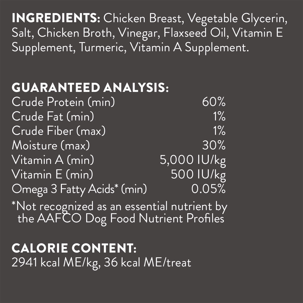 Each meaty treat contains antioxidant nutrients from vitamin A and E to support your dogs immune system plus flaxseed oil and turmeric. Made in the USA with real chicken breast as its #1 ingredient, this jerky has a bold flavor dogs love.
