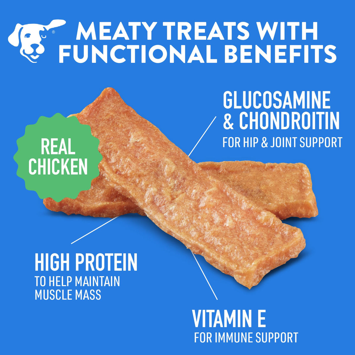Support your dogs active lifestyle with a chewy jerky treat that tastes good and does good. High-quality protein from real chicken breast maintains muscle mass and delivers a meaty flavor dogs love while glucosamine, chondroitin and nutrients work to promote your dogs hip and joint health now and into the future.