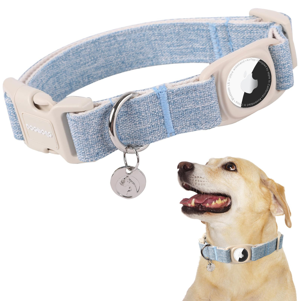 Dogwong Airtag Cotton Hemp Dog Collar, Heavy-Duty With Airtag Holder, Blue, Natural Fabric, Cute Puppy Necklace For Small To Lar