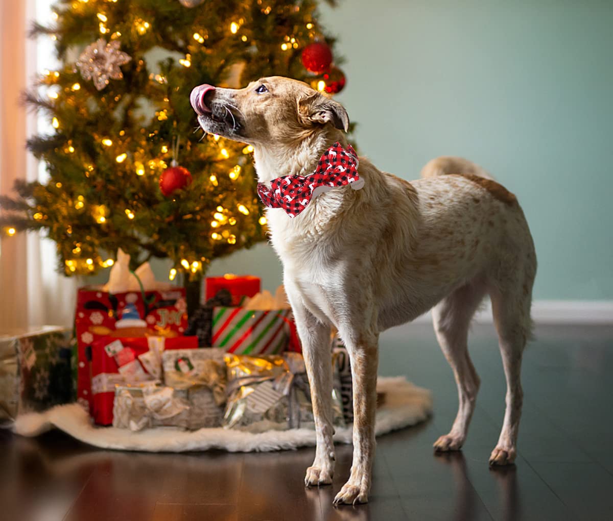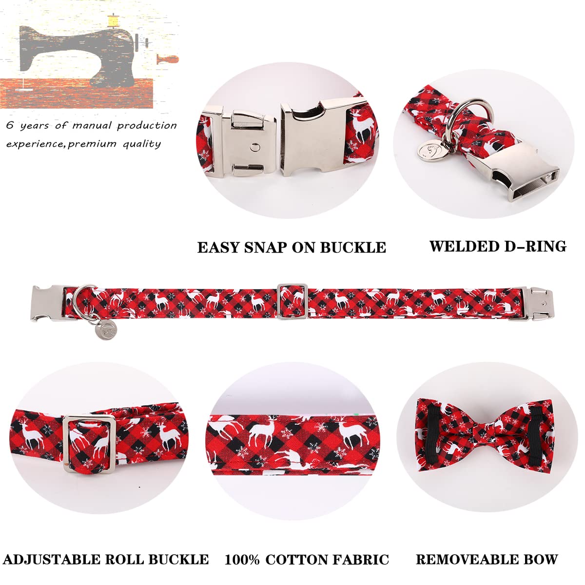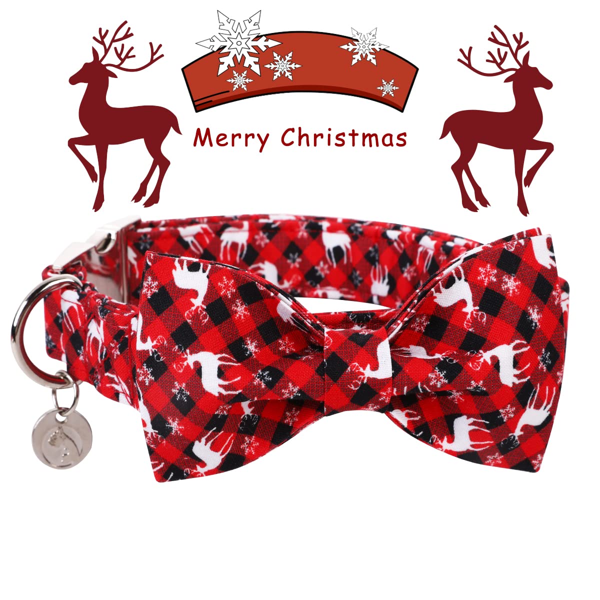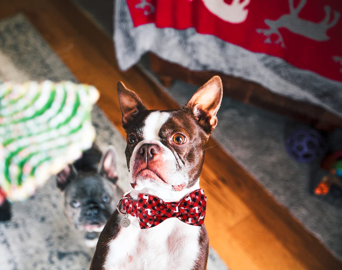 Dogwong Christmas Dog Collar With Bow Tie, Red Plaid Deer Dog Collar Soft Durable Adjustable Cotton Puppy Collar For Small Mediu