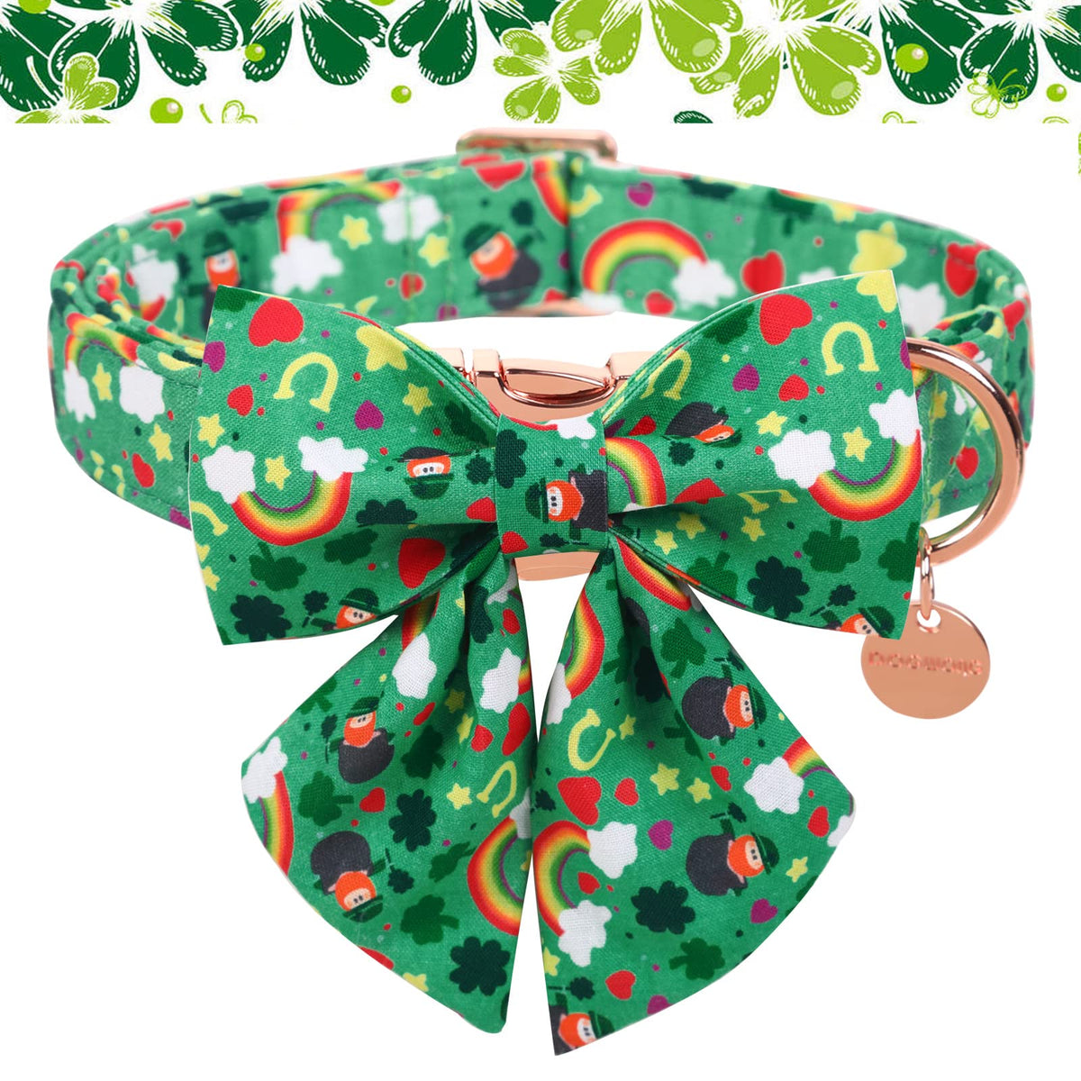 Dogwong Green Lucky Clover Shamrock Dog Collar With Bowtie, Soft Adjustable St. Patrick'S Day Lucky Charm Puppy Collar For Small