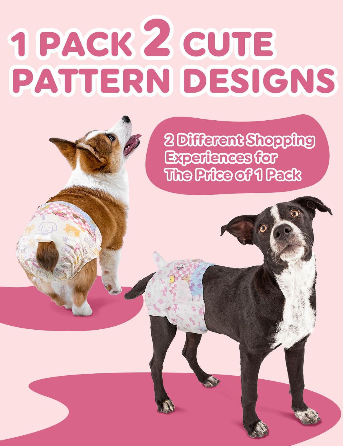 2 Cute Patterns: Dono Female Dog Diapers with Two Cute Designs 24-Pack for Extra Large Capacity and Value. Suit for Multi-Pet Households Each Dog Gets an Exclusive Pattern.
