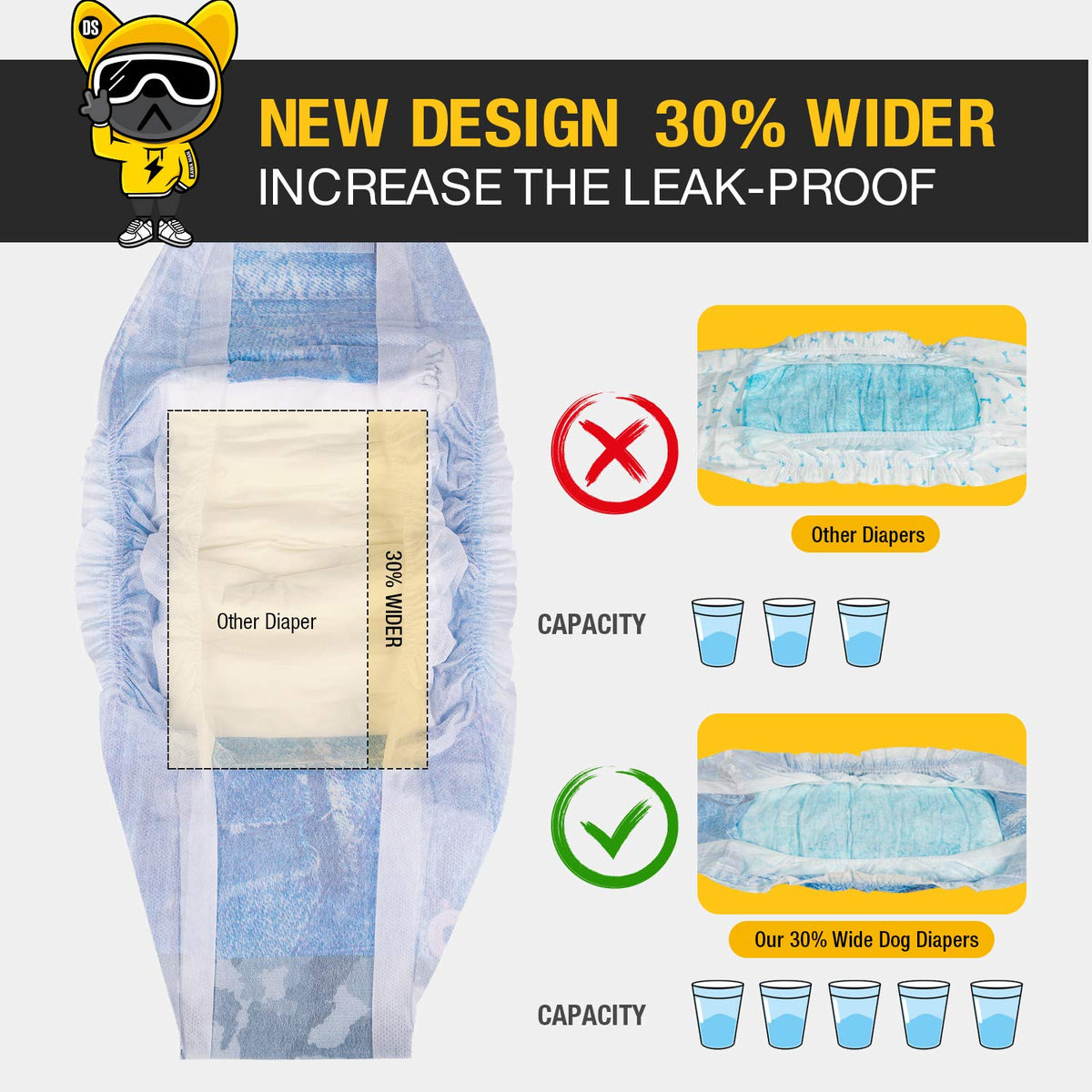Q: What makes Dono Dog Diapers absorbent and leak-proof?A: Dono Dog Diapers use a super-absorbent core made with rapid Dry Gel Technology, which quickly absorbs urine. The double-edge leak-proof barriers enhance their reliability, preventing any leaks and ensuring cleanliness.