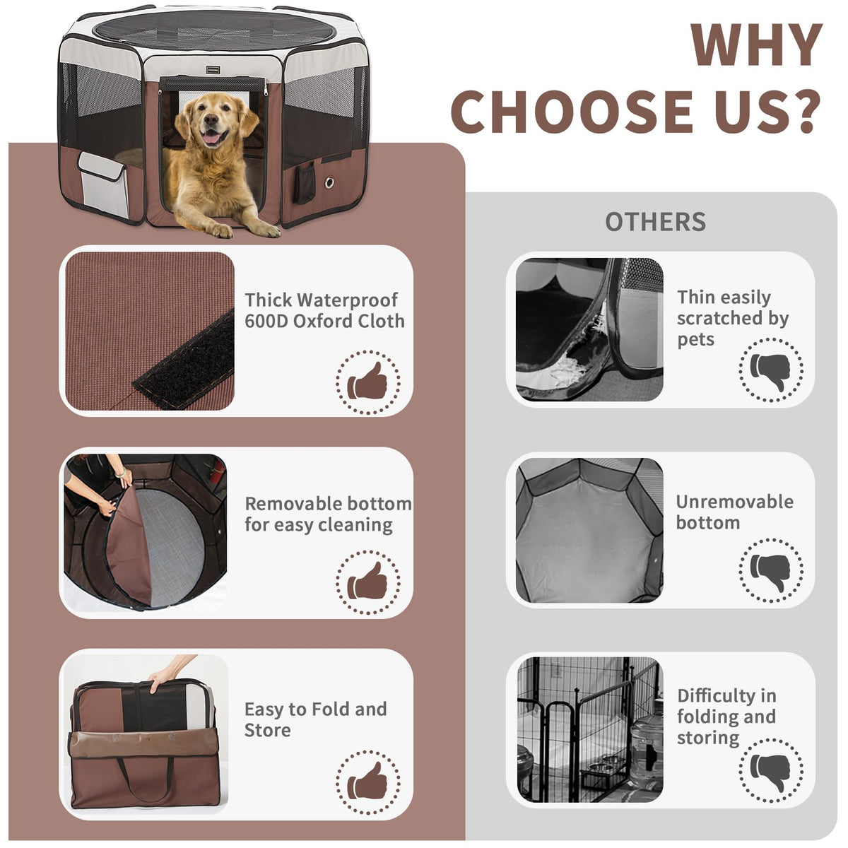 Q: How does the mesh design benefit my pet?A: The playpen features 8 mesh windows and a complete mesh roof, ensuring proper ventilation and visibility. This design helps prevent your pet from feeling anxious while allowing you to keep an eye on them.