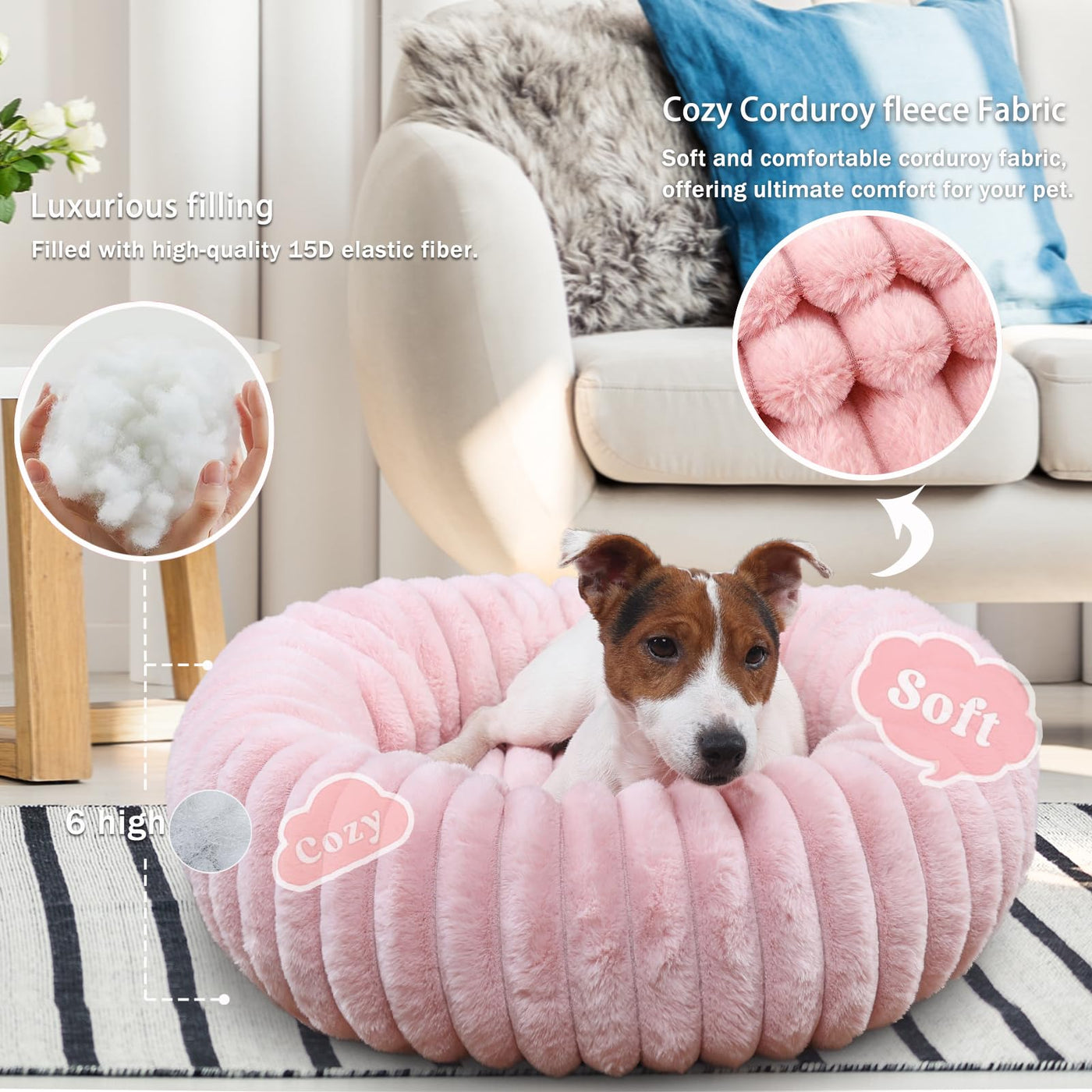 Donut Small Dog Bed Washable Cute Puppy Beds With Corduroy Fleece & Anti Slip Bottom, Round Faux Fur Pet Snuggle Beds For Large