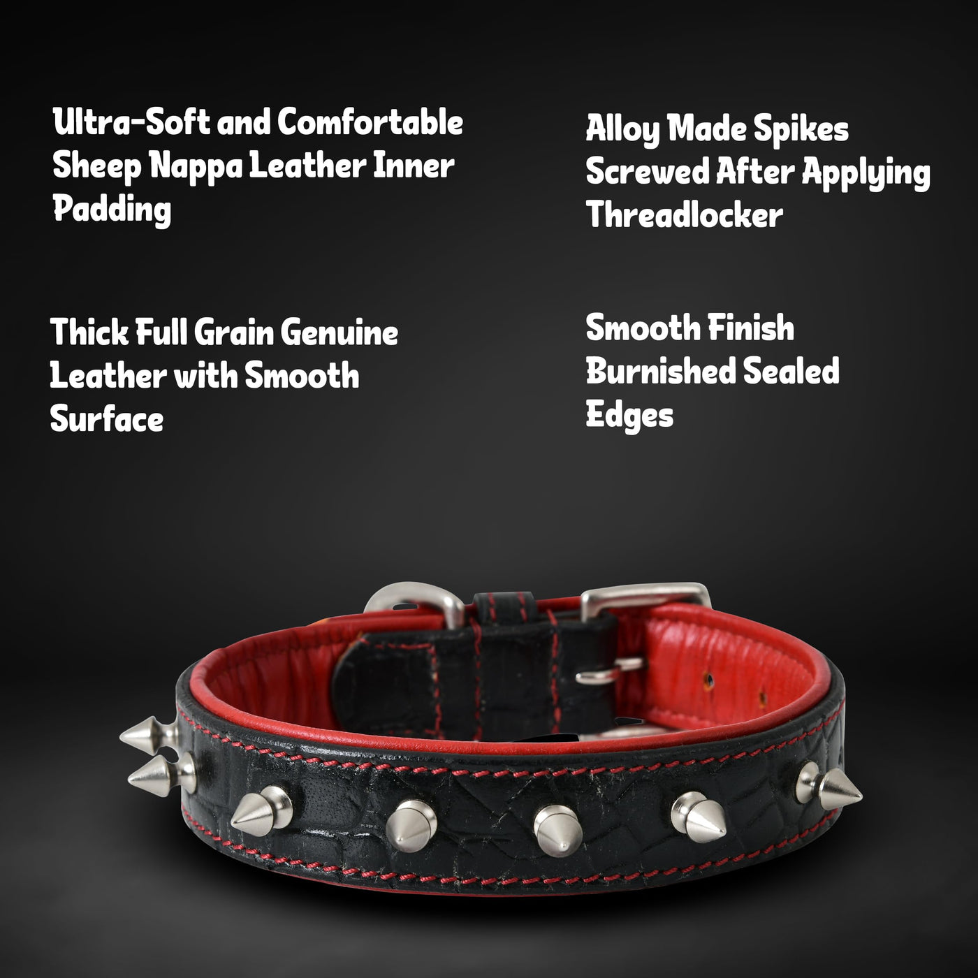 Dowgclub Spiked Leather Dog Collar - 1 Inch Wide Full Grain Bridle Leather, Crocodile Pattern, Heavy Duty Padded Design - For Sm